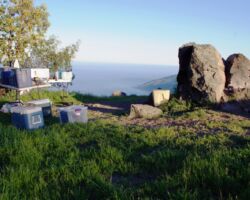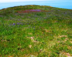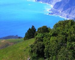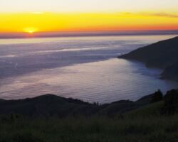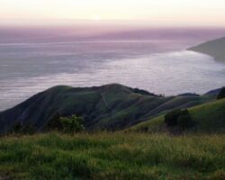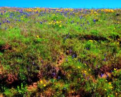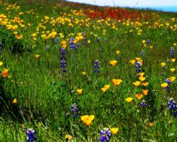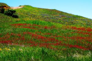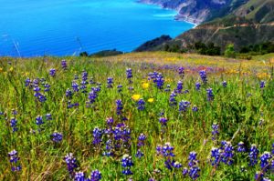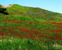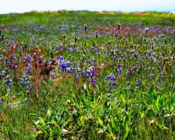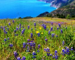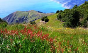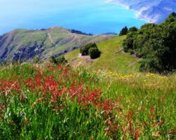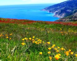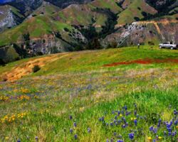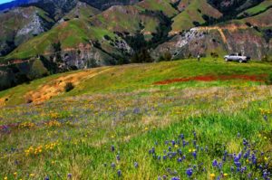We stopped in an open ridge, covered in wildflowers with a short track leading to a spectacular camp site. There was no cover, shade or shrubbery, so it was very exposed, but that also made it a super spectacular setting. Plus, the site was surrounded by and covered with wildflowers; purple and blue Lupine, Poppies galore, and patches of deep red – maybe Delphinium or a sage. I am certain I heard Julie Andrews or Steve warbling out a melody uplifted on the coastal thermals. If not for the wind, and perhaps a few degrees cooler, maybe a tad of cloud cover, this spot would make an excellent home. Although much farther down the slope, it did not have the wide open views of up above. But it did look right out to the ocean, and you could see more details of the coast line, maybe even hear the waves on accession.