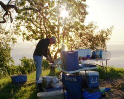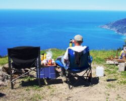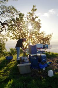 We couldn’t stay long, it was too sad to see so many people packed into this area. It had been 6 years since we had been here but boy had the word gotten out. We scrambled back down the road we had come from to escape the masses and the buzz of people and rigs and noise. When we got back to our spot, our new neighbors still had not returned from their ray excursion. We were happy about that. We moved our chairs to the edge of the camp, behind the kitchen, where the hill falls off the Continental shelf into the Pacific. Here we found shade, and calm, and quiet.