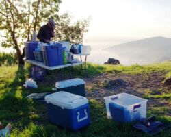 We stopped at not much more than a wide spot in the road for a break. The East side of the road was a vertical rock wall with wildflowers and yucca and succulents clinging in every nook and cranny on the face. The West was totally open – nothing taller than waist-high brush and view out over the Pacific and across to the next ridge. We parked the truck along the road to block it and potential dust/noise from passing vehicles. There was plenty of room for tents, kitchen, etc. and another vehicle or two parked along the road for maximum protection. It was along the road so you certainly didn’t feel way off in a secluded spot, but you also got the overexposed feeling from being the highest thing from that point to one of the Hawaiian Island volcanoes.