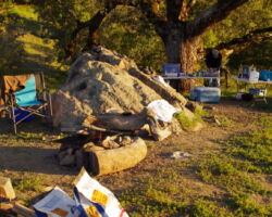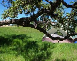 The vehicle moved on down the road and we again were filled with joy that we had found and occupied this spot. We went about setting up the kitchen by the oak tree and the grinding rock and then our tents and bedding. We were getting settled in to our chairs as another rig slowed and looked the site over. This time, a guy parked and walked across the opening to us. He said he and his girlfriend had been looking for a spot to camp and had been asked to leave when they attempted to settle in too close to another group.