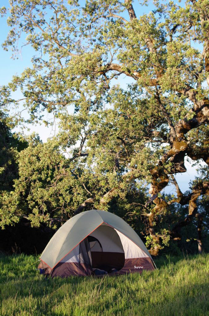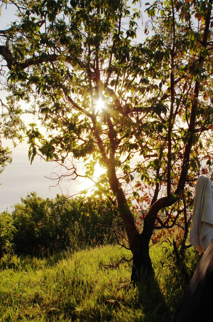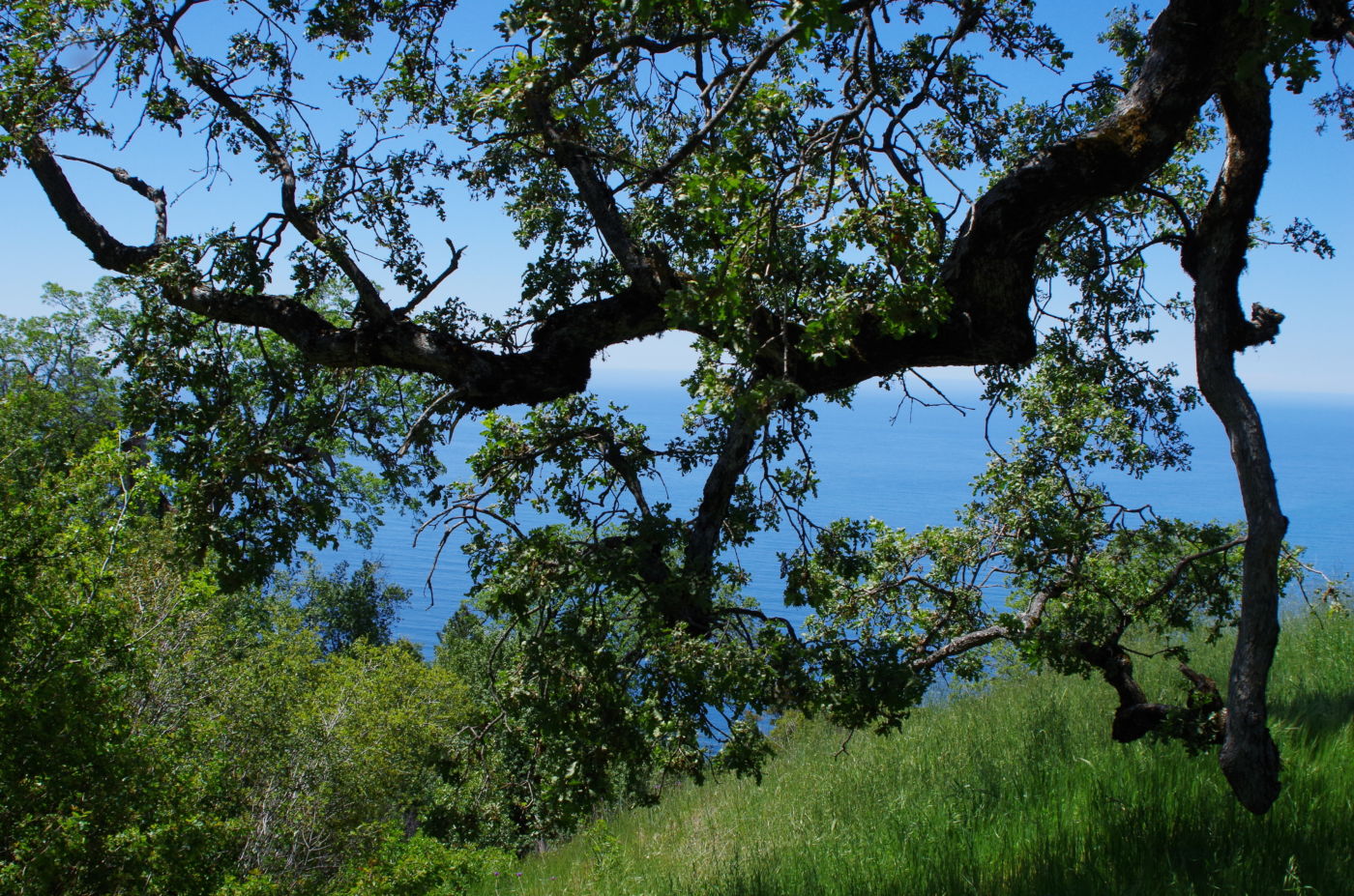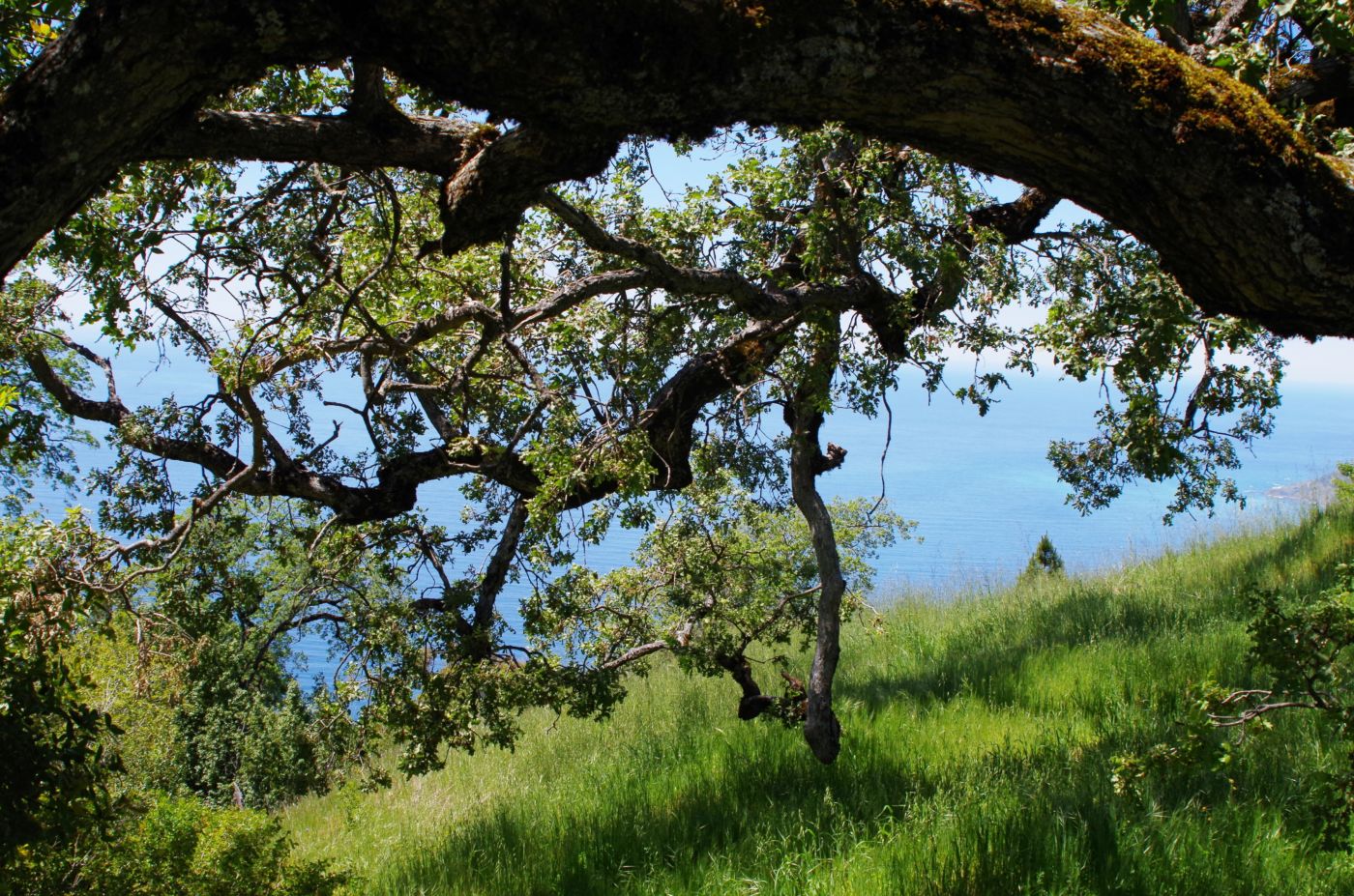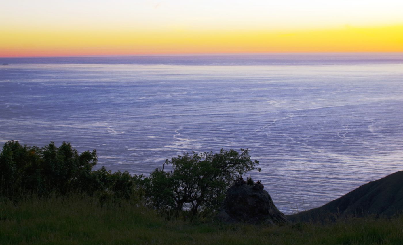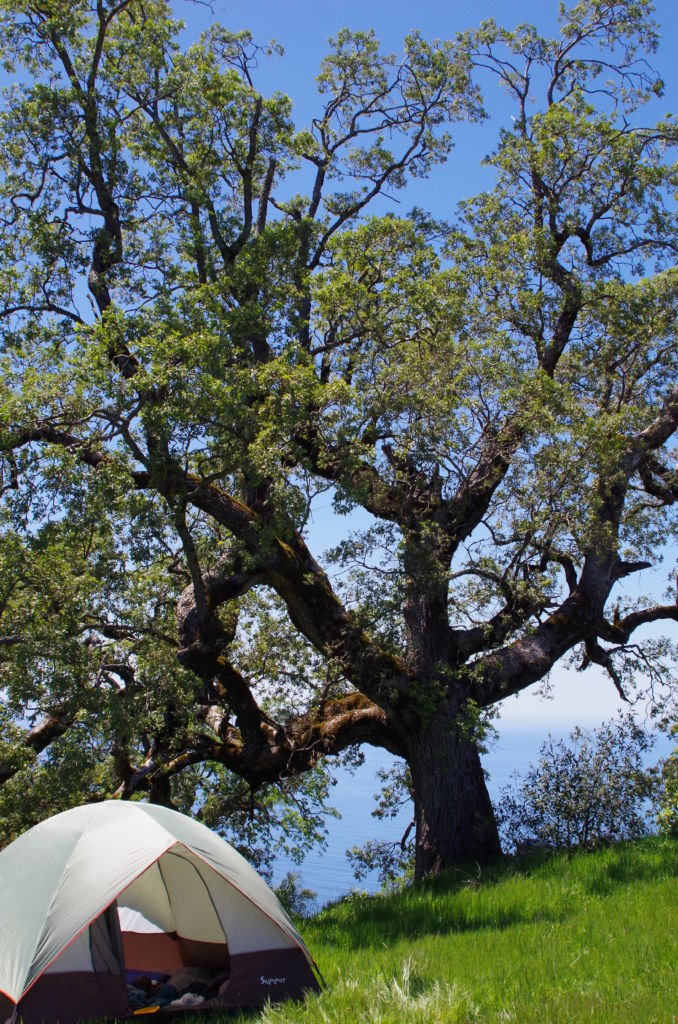 We cooked and ate and stared at the ocean and stared at the ocean and stared at the ocean some more. It truly was mesmerizing and we felt every bit the lucky fools that we were. As darkness fell, we cleaned up a bit, added a small amount of wood to the fire, but kept it low because of the persistent wind. We had to put on a top layer of wind protection, while not zipping up or getting too hot, because it was anything but cold. But the wind would not mellow out and it substantially diminished the quality of the sitting around the fire experience, so we headed off to bed before too long. When I awoke to pee at some point in the night, it was stone calm and silent. The half-moon was still super bright and it lit an eerie glow over the grassy knoll. The white bark of the oak tree reflecting the moonlight was truly magical.