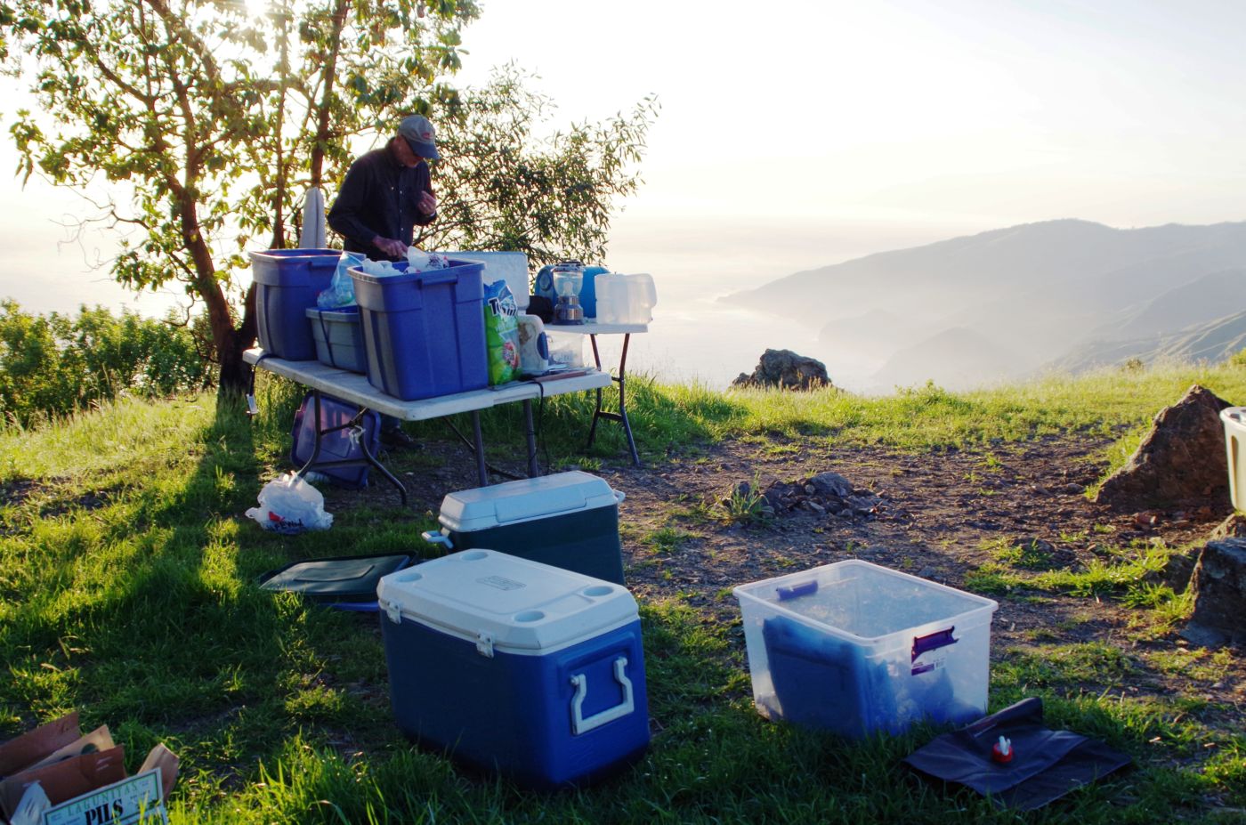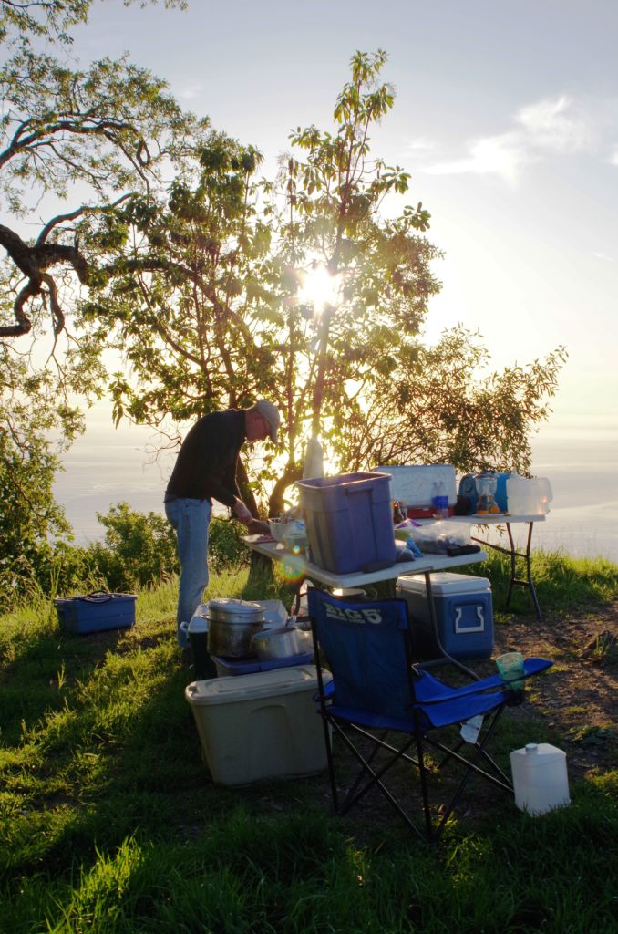 We stopped at not much more than a wide spot in the road for a break. The East side of the road was a vertical rock wall with wildflowers and yucca and succulents clinging in every nook and cranny on the face. The West was totally open – nothing taller than waist-high brush and view out over the Pacific and across to the next ridge. We parked the truck along the road to block it and potential dust/noise from passing vehicles. There was plenty of room for tents, kitchen, etc. and another vehicle or two parked along the road for maximum protection. It was along the road so you certainly didn’t feel way off in a secluded spot, but you also got the overexposed feeling from being the highest thing from that point to one of the Hawaiian Island volcanoes.