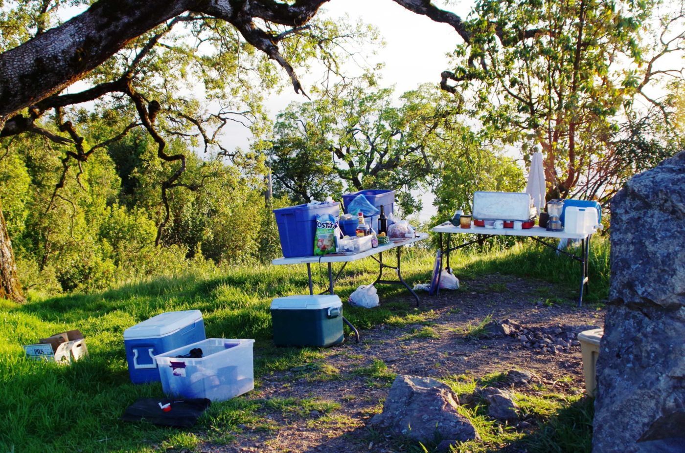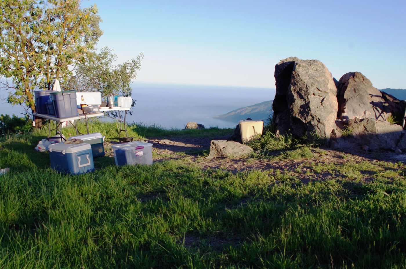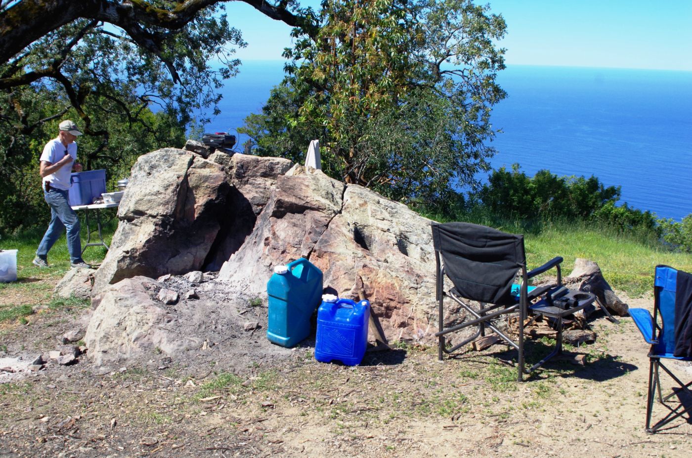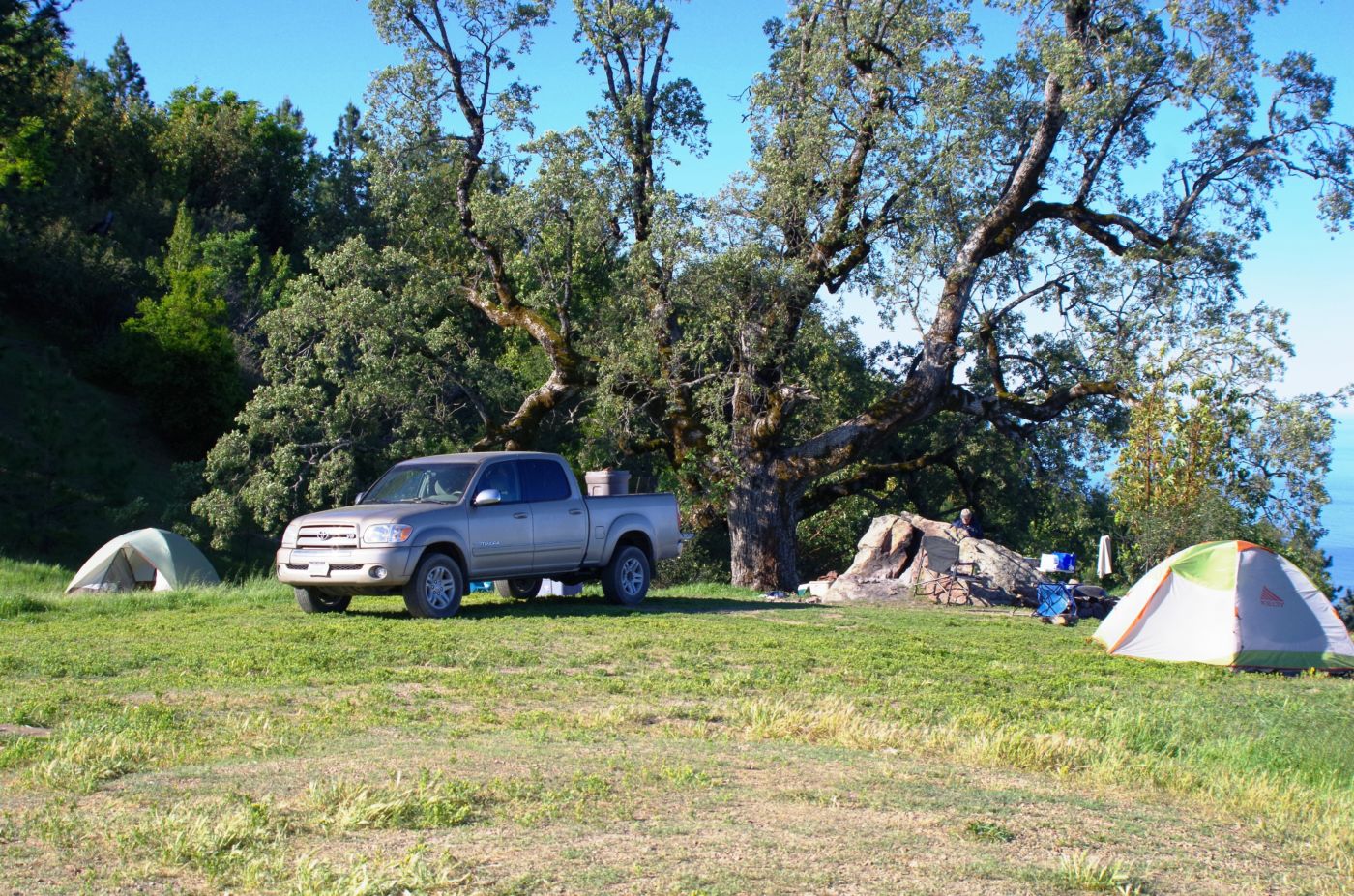 We maneuvered the rig over to the grinding rock and unloaded and hunted for the most level spots to put our tents. I ended up near the ravine under the oak tree set back from the edge a little with a mottled ocean view through the massive branches of the oak tree. Steve went for full view perched out in the open on the edge of the precipice. We were unloaded and pulling the truck out away from the camp so we didn’t feel it so much, when a rig came down the road and slowed to check out our spot. I was glad I was in the rig moving it as it may have given the impression we were occupying more of the total area than we were, as 70 % of the clearing was vacant – not being near the edge with the view but below the rise from the high point in the middle to the road.