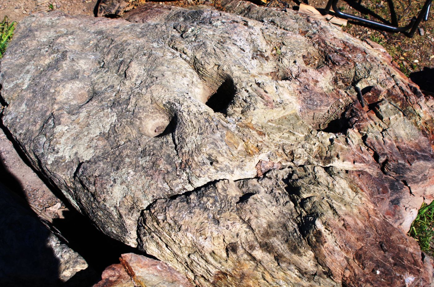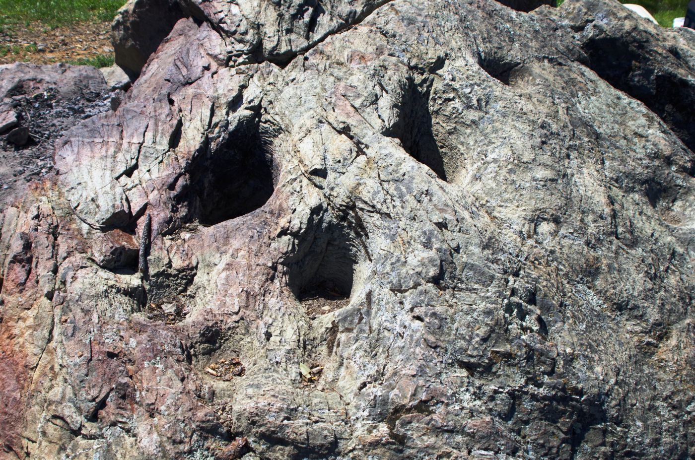 The clearing was circular, occupying a large portion of the inner loop of the road. On the left/South side was a shallow depression that could be seen despite the tall grass. It could carry water in the wet season, but now just looked like a grassy nook. At the end of the nook, just before the hill gave away sharply, was a massive White Oak spreading its massive arms perfectly, with many smaller limbs in a very vertical habit. Most of these then came within feet of the ground and turn upwards, giving the impression of a Chicago horn section. A few feet from the tree, higher up on the flat ground was a large rock, 6 feet around and 4 feet tall. It had 5, 6, 7 grinding holes of various depths but all about the same diameter. The rest of the area, roughly 100’ in diameter was short grass, as if it had been mowed. It was much shorter than the natural grass in the low spot and mush shorter than the grasses on the hillside that dropped off to the West. Just about smack dab in the middle of the entire area, was a rounded knob of bare gravel where no grass grew. This was the high point and about the center point of the opening and although there were very few truly level spots, it was incredible to find such a large open area vacant, not up against the road, with some shade, with the grinding rock, and with the best view of the ocean you could imagine.