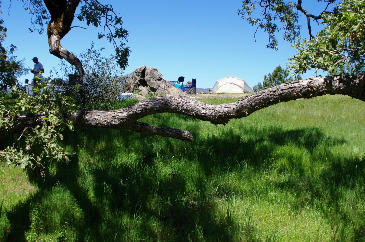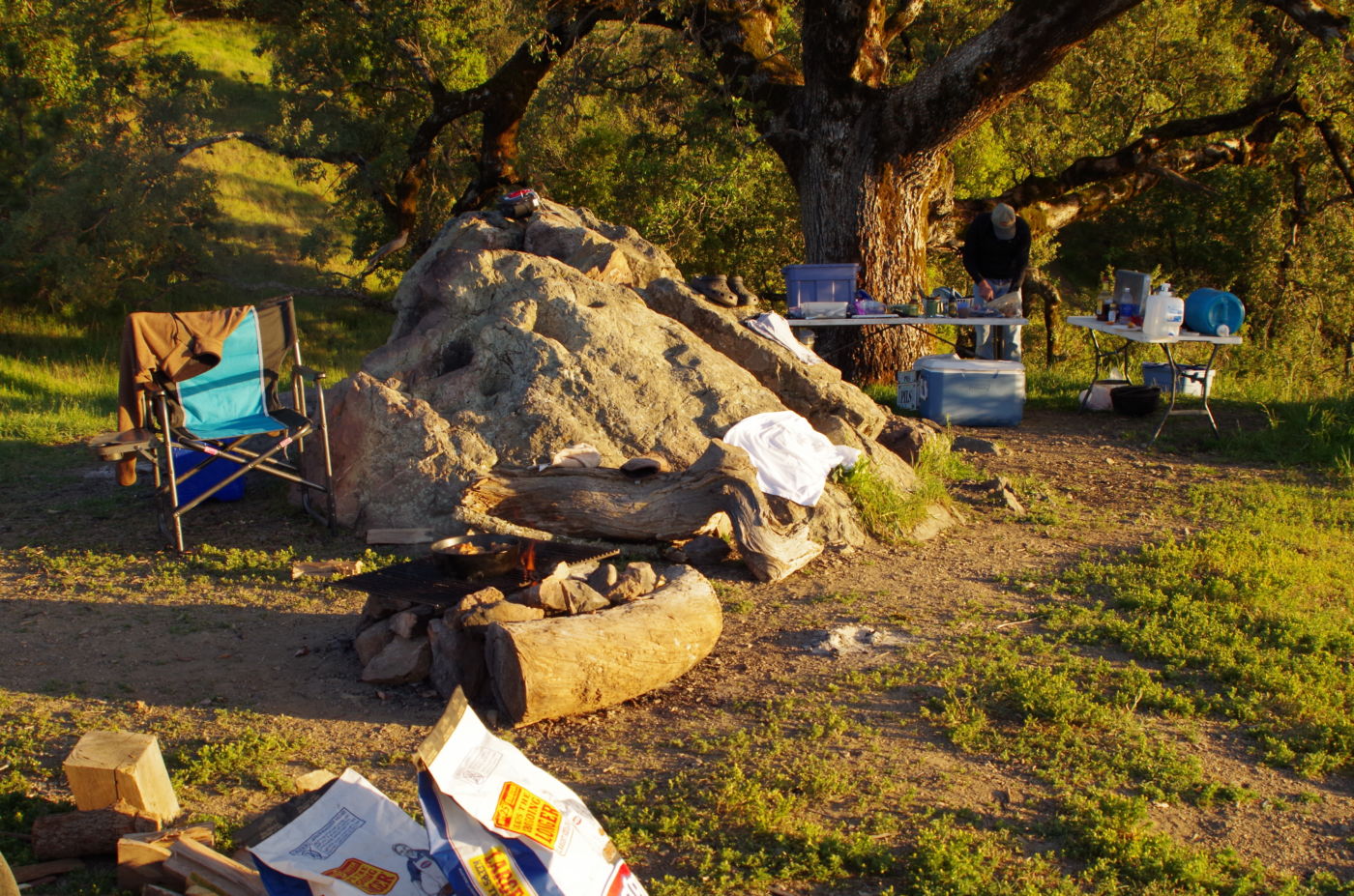 The vehicle moved on down the road and we again were filled with joy that we had found and occupied this spot. We went about setting up the kitchen by the oak tree and the grinding rock and then our tents and bedding. We were getting settled in to our chairs as another rig slowed and looked the site over. This time, a guy parked and walked across the opening to us. He said he and his girlfriend had been looking for a spot to camp and had been asked to leave when they attempted to settle in too close to another group.