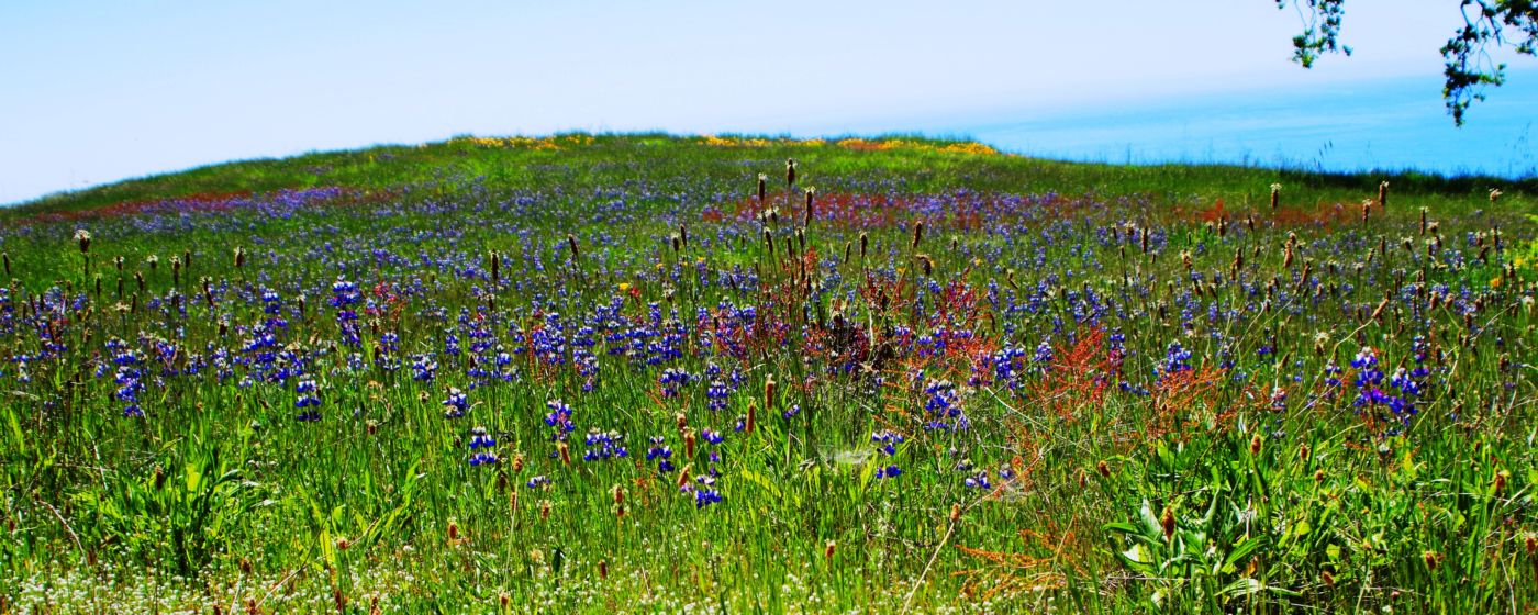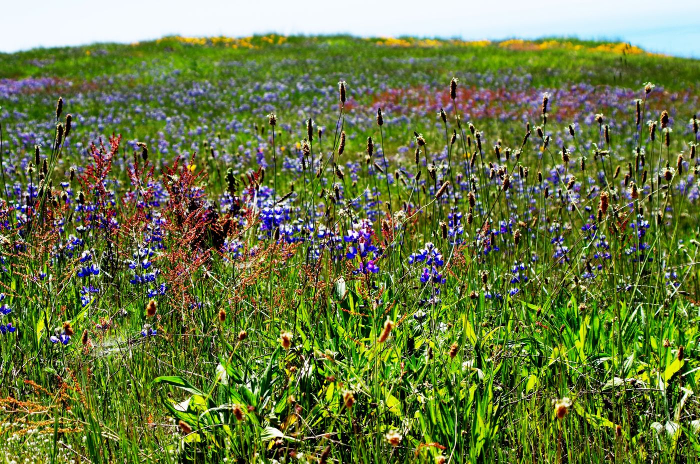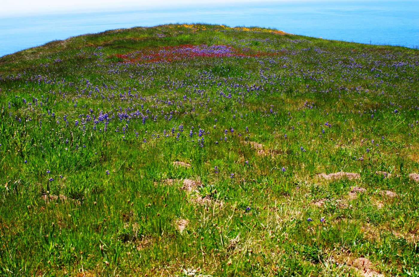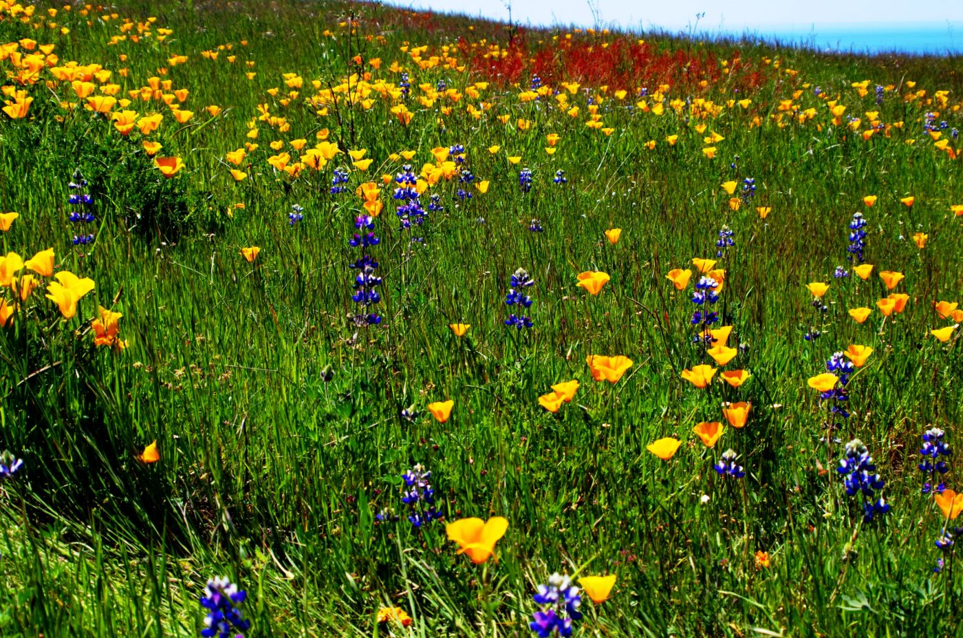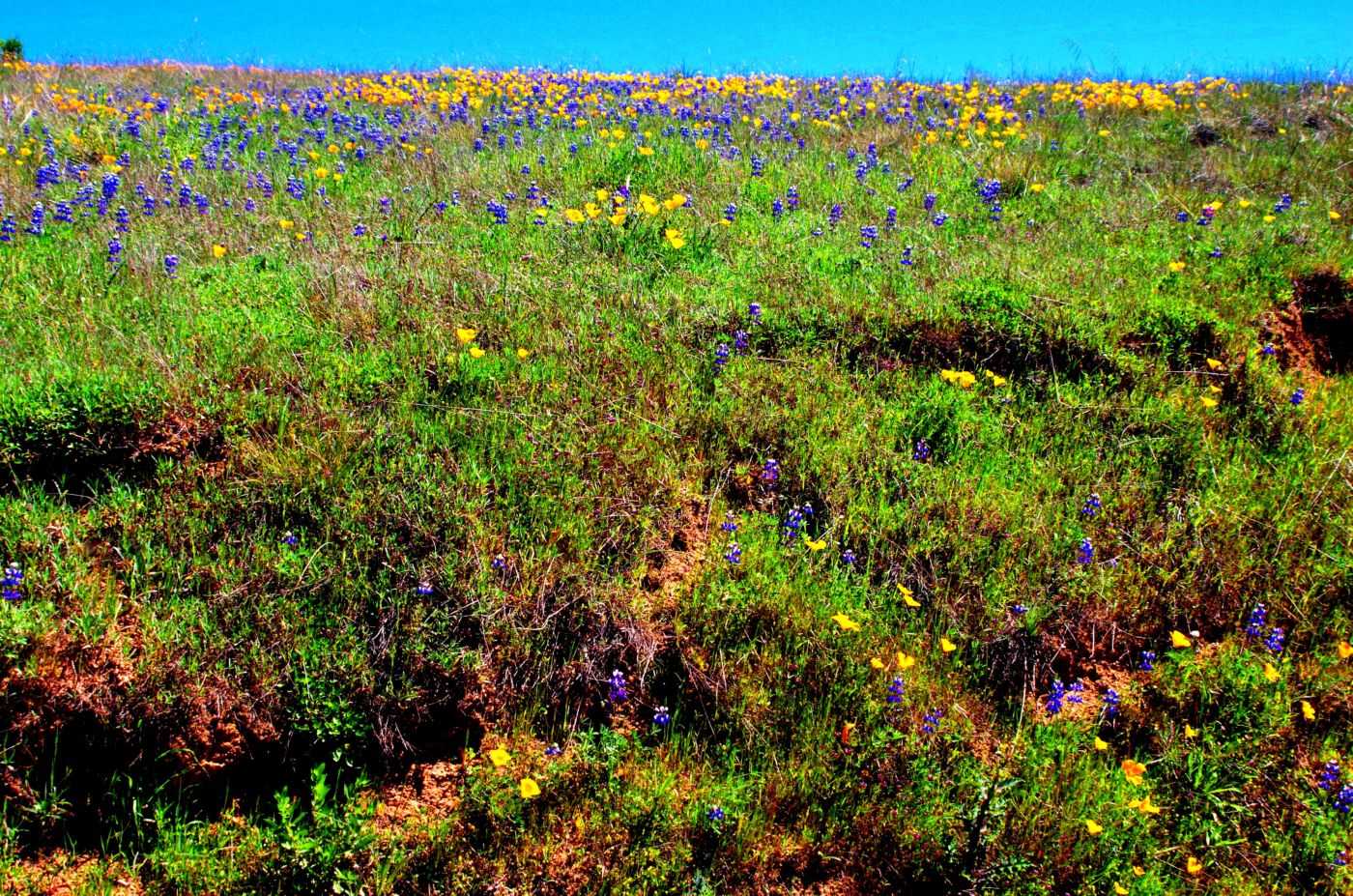 We stopped in an open ridge, covered in wildflowers with a short track leading to a spectacular camp site. There was no cover, shade or shrubbery, so it was very exposed, but that also made it a super spectacular setting. Plus, the site was surrounded by and covered with wildflowers; purple and blue Lupine, Poppies galore, and patches of deep red – maybe Delphinium or a sage. I am certain I heard Julie Andrews or Steve warbling out a melody uplifted on the coastal thermals. If not for the wind, and perhaps a few degrees cooler, maybe a tad of cloud cover, this spot would make an excellent home. Although much farther down the slope, it did not have the wide open views of up above. But it did look right out to the ocean, and you could see more details of the coast line, maybe even hear the waves on accession.