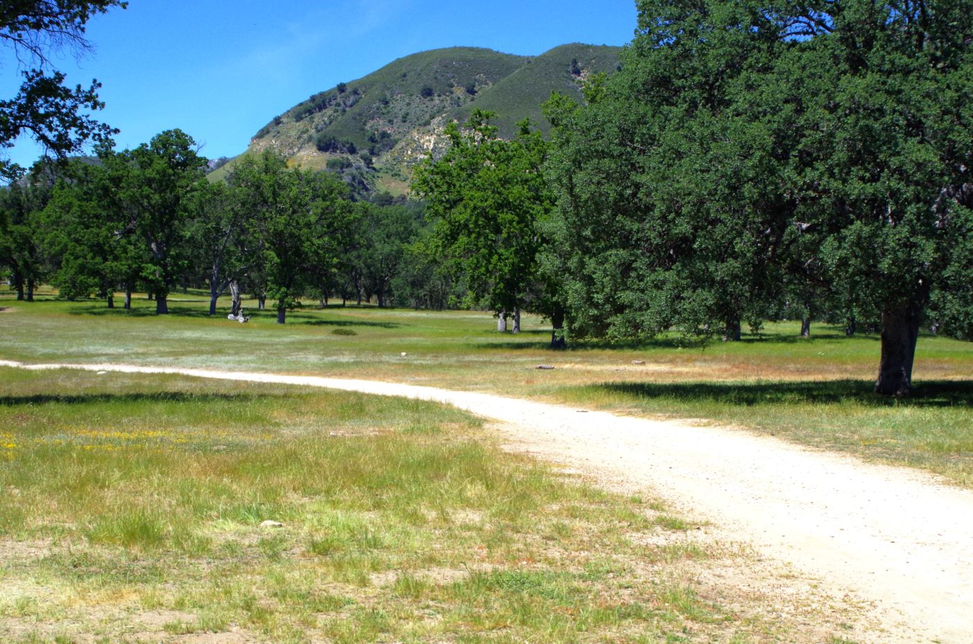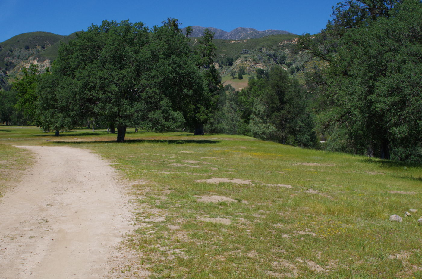 We drove a short loop road that comes along the back side of the rock and along Santa Lucia Creek. It is not a campground having no water, table, rings, etc., but it does get used as such and for good reason. There are numerous large oaks spread over large flat open grassy meadows. There are cows to be sure, but they may be kept on the North side of the road. There are a few other short roads or spurs that head down to the creek for other dispersed camping spots near the creek in the 5 mile stretch or so of road between the NF-HL boundary and the Santa Lucia Memorial Park that enjoys a fantastic setting at the head of the valley and the confluence of several creeks draining the higher elevations of the Santa Lucia Mountains and the Ventana Wilderness. We drove loop Road #4 and stopped at a site above the creek in the shade of the oak to have a little snack and a refreshing beverage. It was a great spot with creek and rock views and no one else in sight. There were perhaps only 3 or 4 other camps set up in the entire area. There were maybe a dozen cars parked at the trailhead by the rock formation, but all the people must have been out on the trail or down at he crick. It is definitely worth a return visit for a prolonged stay.