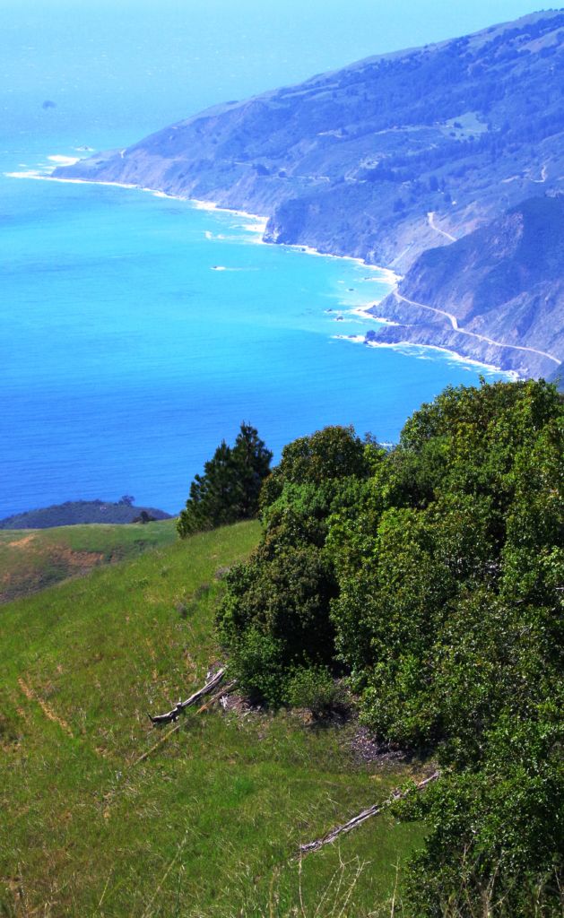 The ridge to the left/South, on the other side of the low trench and the oak tree, extended out far enough to block the view. The view due West and Northwest was totally unobstructed Pacific ocean. To the North were the 2 peaks of “Cone Peak” at about 5155’ elevation. Behind us to the East, you could see the 500 yard super steep stretch of FS 23S02 that is paved cut across Chalk Peak. This spot was brilliant.