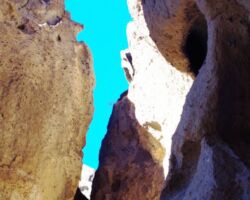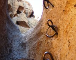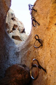 As short as the distance was in the tiny passageway, it was still terribly impressive.  Literally no wider than our shoulders, we stepped down the steel rods that had been pounded into the canyon walls, without which, passage would not have been possible.  I would have gone back up and then some again, if I had known the stretch in the narrows was so short, the shear walls rising one hundred or more feet above.  Within a few steps out of the canyon, one could no longer see a way through; no such passage existed, just shear walls.