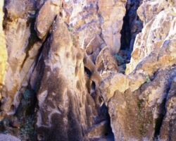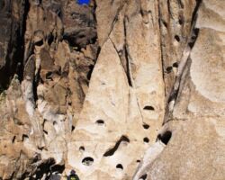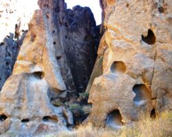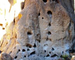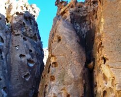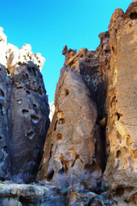 A spell-binding feature of the Eastern side of the walls were these incredible hallowed out etchings; hundreds of them, large and small, faces and shapes, and formations no 2 alike.  It looked like prime real estate for rodents and birdies, and their abundance seemed to corroborate the assumption.  We were treated to some aspect ratio with the presence of a young couple hiking in from the East side.  Their tiny little human bodies and the ability to see beyond the vertical canyon walls up to the top of the rounded peaks, entrenched the perspective of our insignificance.  A couple specs, in front of massive canyon walls, below a mountain that is a tiny spec upon the alluvium, amidst a mass of desert of a landscape as far as one could see.  Humbling perhaps.