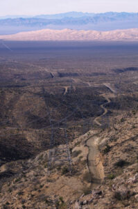 We tried.  At a significant “Y” in the road, one arm being that thin, twisting grade up the rock face, we chose the soft gentle sandy wash to the right, only to be rebuffed after a very short distance.  I was not happy about this, but the top looked very much within reach, so we headed up what we hoped was a brief stint on this electrifying rock path carved out of the side of the rock, not only because it was one hell of a ride, but also because the power lines were crackling with enough lost energy to make our hair stand up and our brains warm.  It was a very uncomfortable feeling to be underneath them, but there was nowhere else to be.  I didn’t see the road again for many miles as it lay well below my hood until we reached the decline on the West side of the range.
