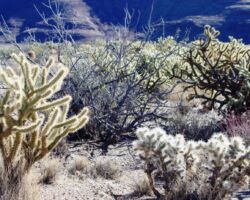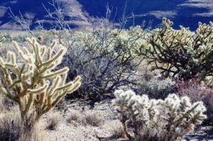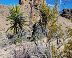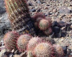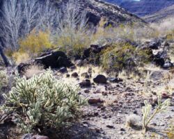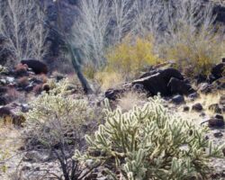 Bob and I picked our way along the trail, looking to the intersection of the trail that should lead back to Wild Horse Canyon Road where we had left my truck and hopefully the provisions for the day as there was some considerable confusion at the parting of the vehicles what and whom went where.  We saw a lone youthful hiker come down from the much longer Gold Valley hike, however watching his progress brought our attention to the older, taller scamps making their way through the cholla, barrel cactus, yucca, and creosote bush.  We considered trying to hide and surprise attack them, but cover was scarce.