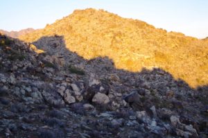 We stopped out and about for a snack.  The air was cold but calm.  It was totally calm and quiet and we absorbed the landscape and geography.  A single car passed by.  In a short bit, we passed by Rock Spring and the stone house that Bob and I visited last time.  We had connected another dot and it felt great.  As we approached Black Canyon Road, the cliff faces of the Pinto Mountains were ablaze in the low light.  The light tan and white soils glowed in the sun reflecting light all over the valley.  It was truly a spectacular moment to be passing by, another special moment to share with my friends and experience out and about.