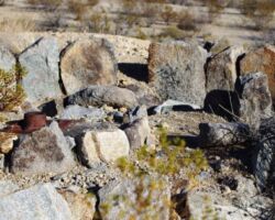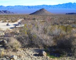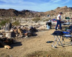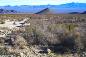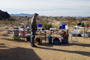 I don’t think we connected with Bob and Steve until we were out 58 and they were a bit ahead of us.  We met at the intersection of Essex Road and Black Canyon about 1:00 and there was much rejoicing.  The weather was great and we had an easy journey thus far.  The first spot we wanted to explore for a camp spot was just a couple miles up the road.  We found the dirt road and passed a large area right near the road, but knew the 2 spots we had the most interest in were just ahead.  We stopped and looked over one strong spot, but decided since it was so early in the day, to continue on to see the other spot.  We soon found ourselves heading out into open desert, thus turned around and headed back to our rock formations jetting up out of the alluvium.  We found the end of the road, a quasi camp spot that looked much more promising from googly earth, and thus headed back to our best option.  We were unpacking by 3:00, very happy with our spot, and ecstatic about being here.