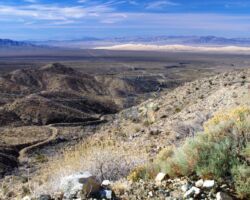 This was an extraordinary drive, offering a spectacular view of the Kelso Dunes far far below.  Kelso Dunes, also known as the Kelso Dune Field, is the largest field of eolian sand deposits in the Mojave Desert. The dune field covers 45 square miles (120 km2) and includes migrating dunes, vegetation-stabilized dunes, sand sheets, and sand ramps. The tallest dunes rise up to 650 feet (200 m) above the surrounding terrain.  The dunes are composed predominantly of light-colored quartz and feldspar, most likely eroded from the granitics of the San Bernardino Mountains to the SW.