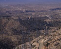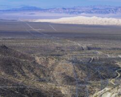 We had to stop several times for Bill to get out and clear boulders from the road.  We did not see another vehicle the entire time we were up on this perch.  Fortunately, the path was carved out of rock and thus was very stable.  At numerous spots along the route, side spurs had been made to let heavy equipment pass each other as they maintained the road or serviced the towers and lines, or headed to the Vulcan Mine.  During World War II, iron ore was mined here and shipped to the Kaiser steel mill in Fontana, ultimately being used to build Liberty ships, like the SS Jeremiah O’Brien docked in San Francisco Bay, one of the very last remaining ships of this era.