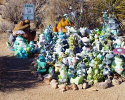 Our first destination was Marl Spring, one of a series of 5 springs along the Mojave Road between the Colorado River and Barstow that would also eventually become the sites of military posts or redoubts, some less than a fort, along the lines of a few huts and crude shelters.  Along the way, we came to a very strange place marked by a well-placed and secured mailbox.  I suppose that led to the erection of a series of odd collections of oddities, oddly placed, by probably some very odd people.  It is not my style, but it was odd, which is generally good.