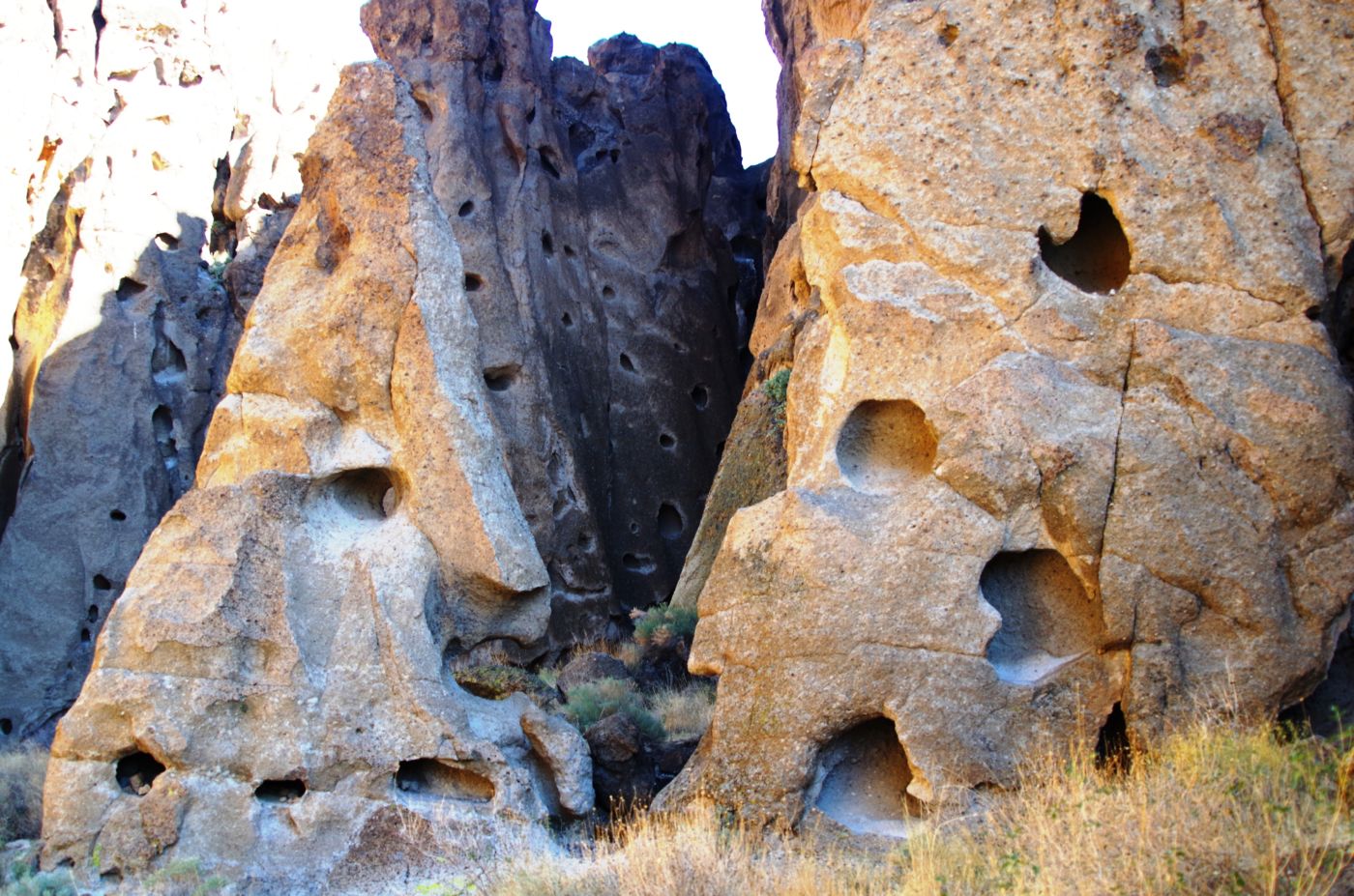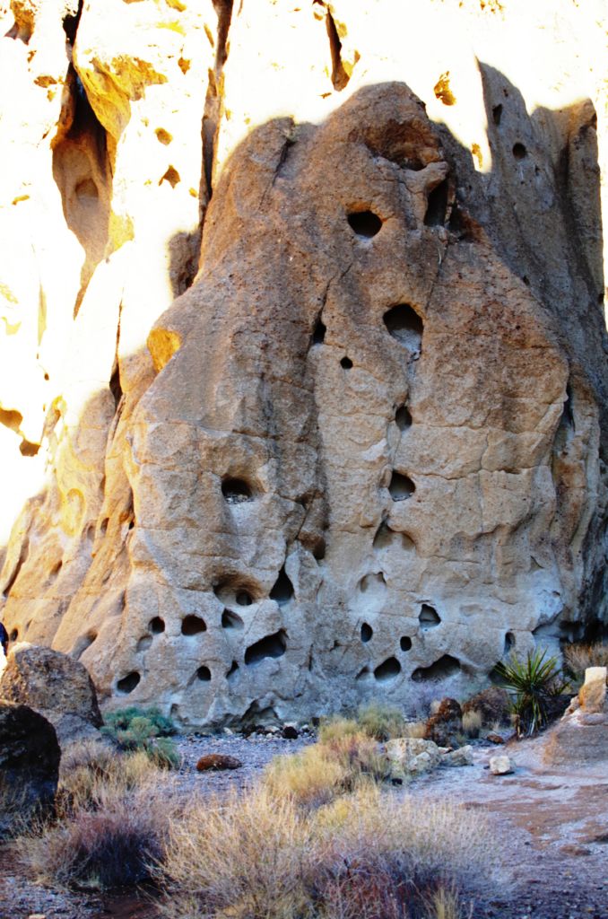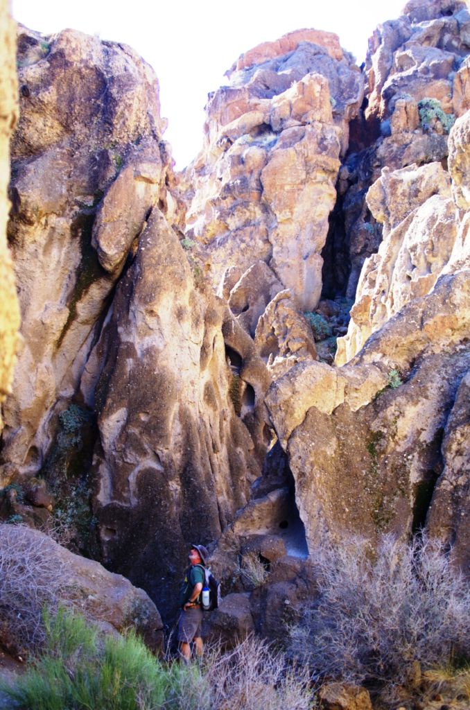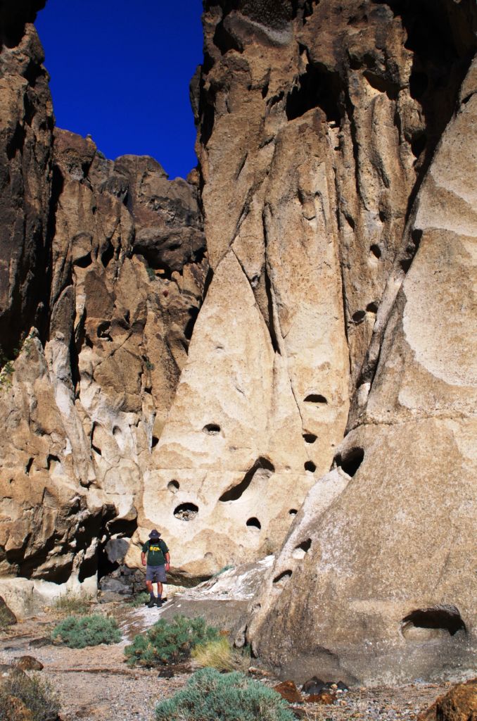 A spell-binding feature of the Eastern side of the walls were these incredible hallowed out etchings; hundreds of them, large and small, faces and shapes, and formations no 2 alike.  It looked like prime real estate for rodents and birdies, and their abundance seemed to corroborate the assumption.  We were treated to some aspect ratio with the presence of a young couple hiking in from the East side.  Their tiny little human bodies and the ability to see beyond the vertical canyon walls up to the top of the rounded peaks, entrenched the perspective of our insignificance.  A couple specs, in front of massive canyon walls, below a mountain that is a tiny spec upon the alluvium, amidst a mass of desert of a landscape as far as one could see.  Humbling perhaps.