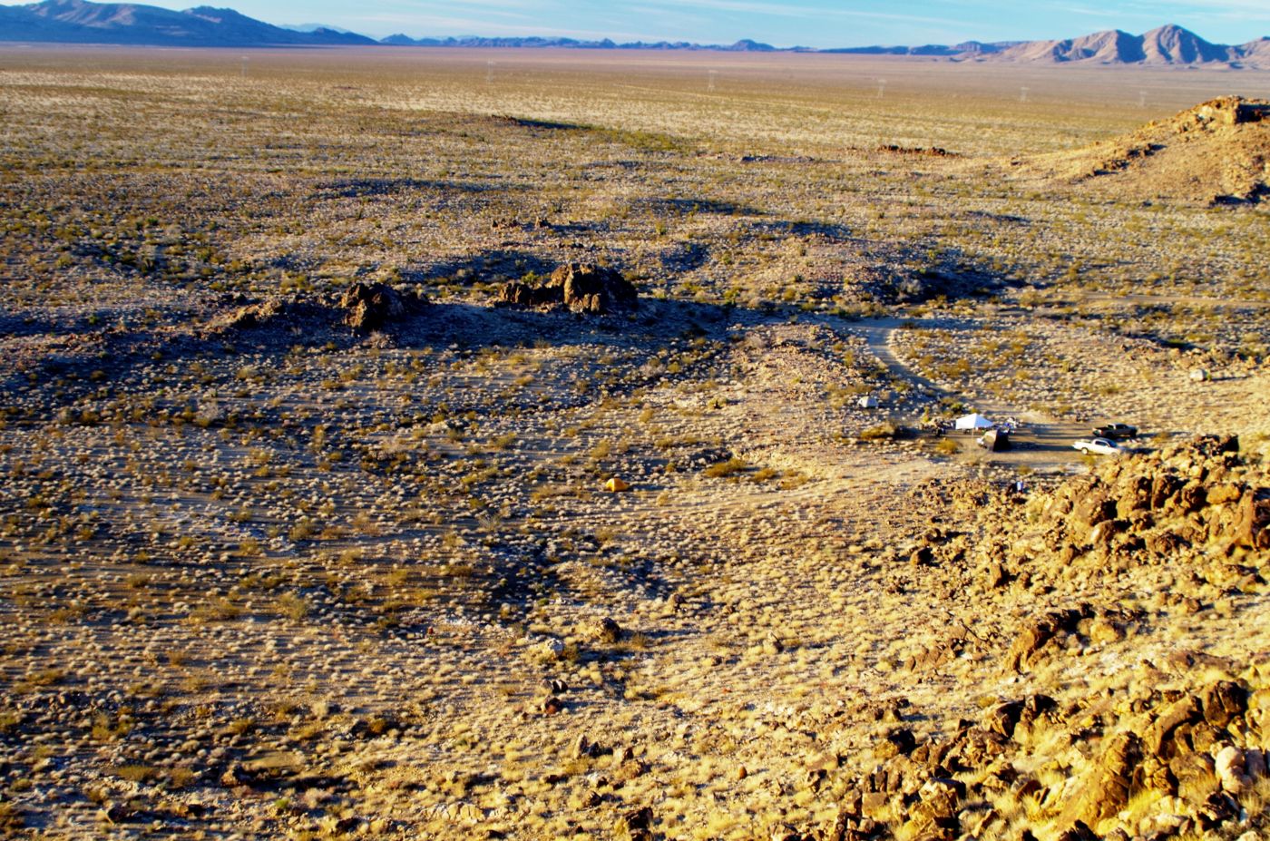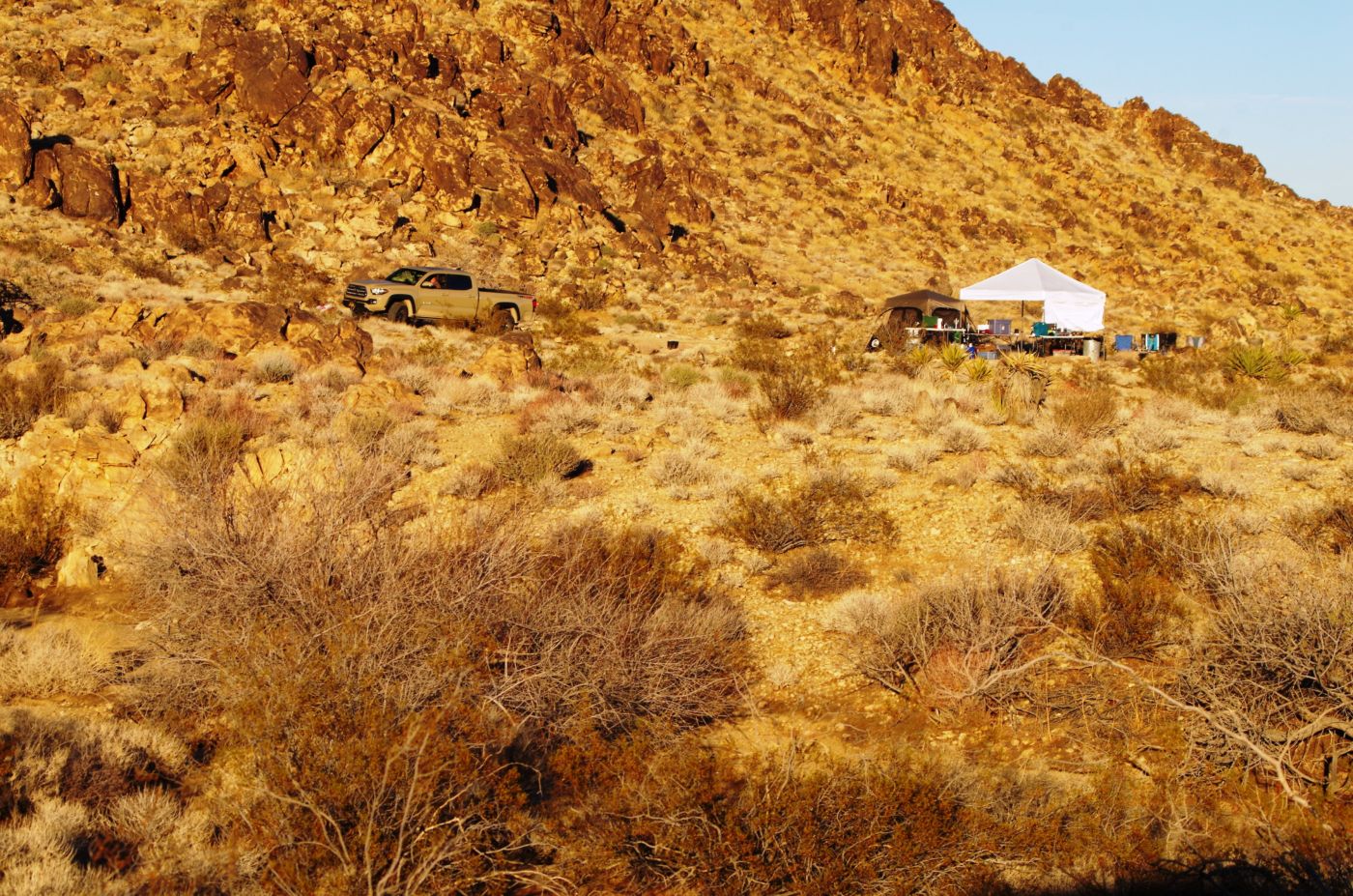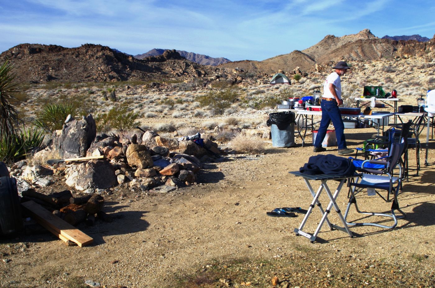 I don’t think we connected with Bob and Steve until we were out 58 and they were a bit ahead of us.  We met at the intersection of Essex Road and Black Canyon about 1:00 and there was much rejoicing.  The weather was great and we had an easy journey thus far.  The first spot we wanted to explore for a camp spot was just a couple miles up the road.  We found the dirt road and passed a large area right near the road, but knew the 2 spots we had the most interest in were just ahead.  We stopped and looked over one strong spot, but decided since it was so early in the day, to continue on to see the other spot.  We soon found ourselves heading out into open desert, thus turned around and headed back to our rock formations jetting up out of the alluvium.  We found the end of the road, a quasi camp spot that looked much more promising from googly earth, and thus headed back to our best option.  We were unpacking by 3:00, very happy with our spot, and ecstatic about being here.