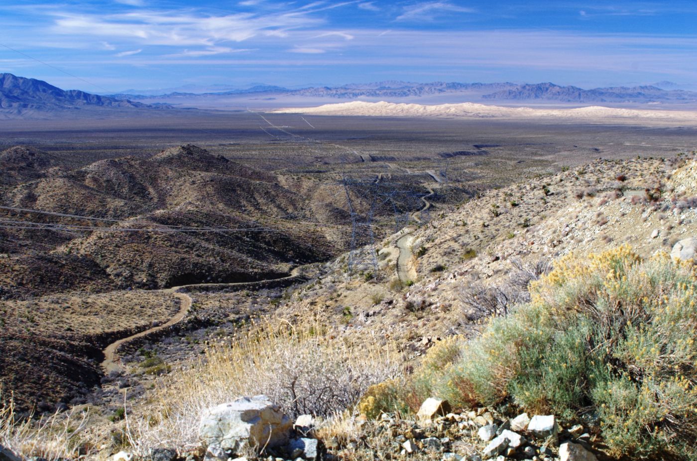 This was an extraordinary drive, offering a spectacular view of the Kelso Dunes far far below.  Kelso Dunes, also known as the Kelso Dune Field, is the largest field of eolian sand deposits in the Mojave Desert. The dune field covers 45 square miles (120 km2) and includes migrating dunes, vegetation-stabilized dunes, sand sheets, and sand ramps. The tallest dunes rise up to 650 feet (200 m) above the surrounding terrain.  The dunes are composed predominantly of light-colored quartz and feldspar, most likely eroded from the granitics of the San Bernardino Mountains to the SW.