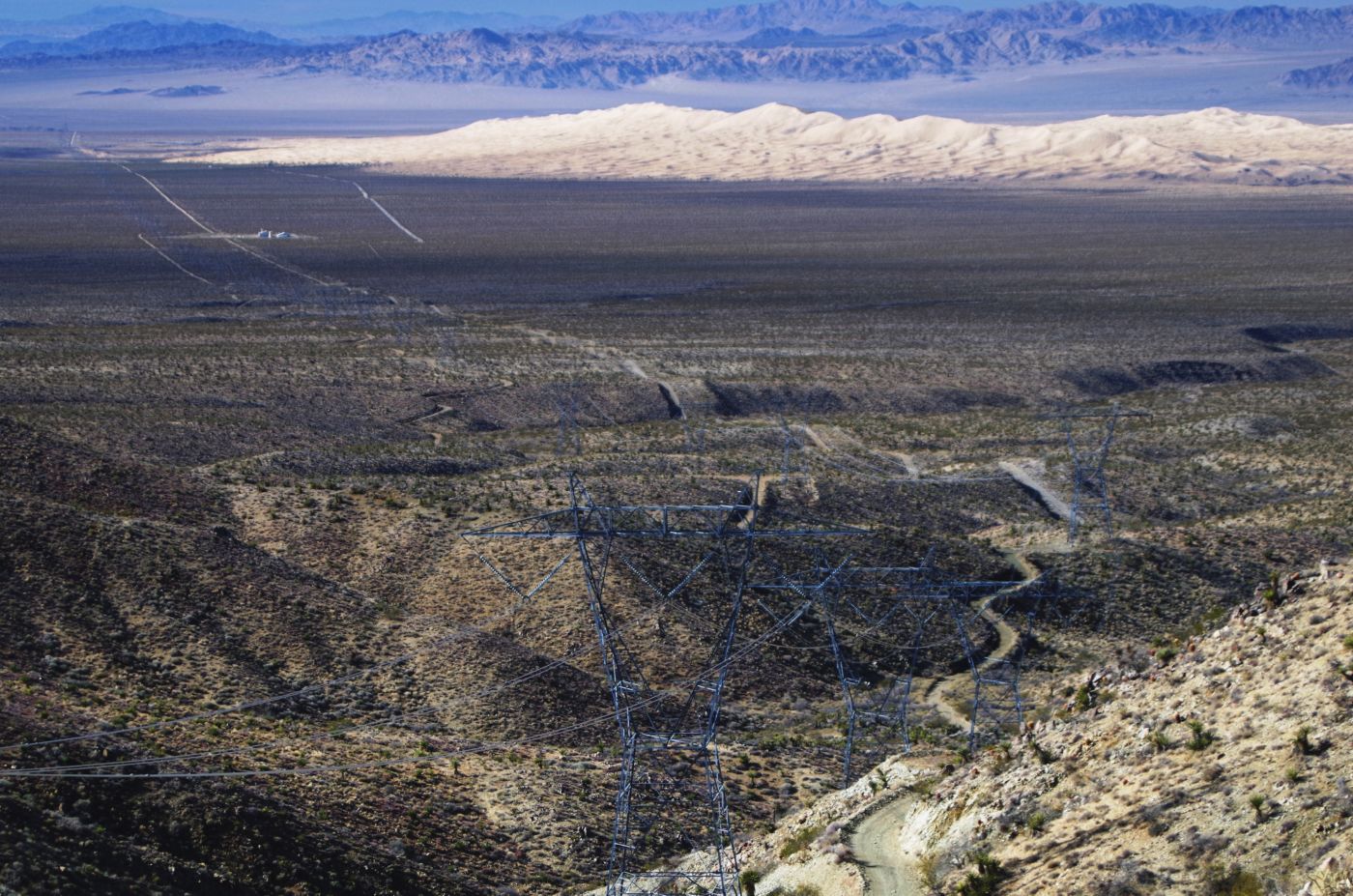We had to stop several times for Bill to get out and clear boulders from the road.  We did not see another vehicle the entire time we were up on this perch.  Fortunately, the path was carved out of rock and thus was very stable.  At numerous spots along the route, side spurs had been made to let heavy equipment pass each other as they maintained the road or serviced the towers and lines, or headed to the Vulcan Mine.  During World War II, iron ore was mined here and shipped to the Kaiser steel mill in Fontana, ultimately being used to build Liberty ships, like the SS Jeremiah O’Brien docked in San Francisco Bay, one of the very last remaining ships of this era.