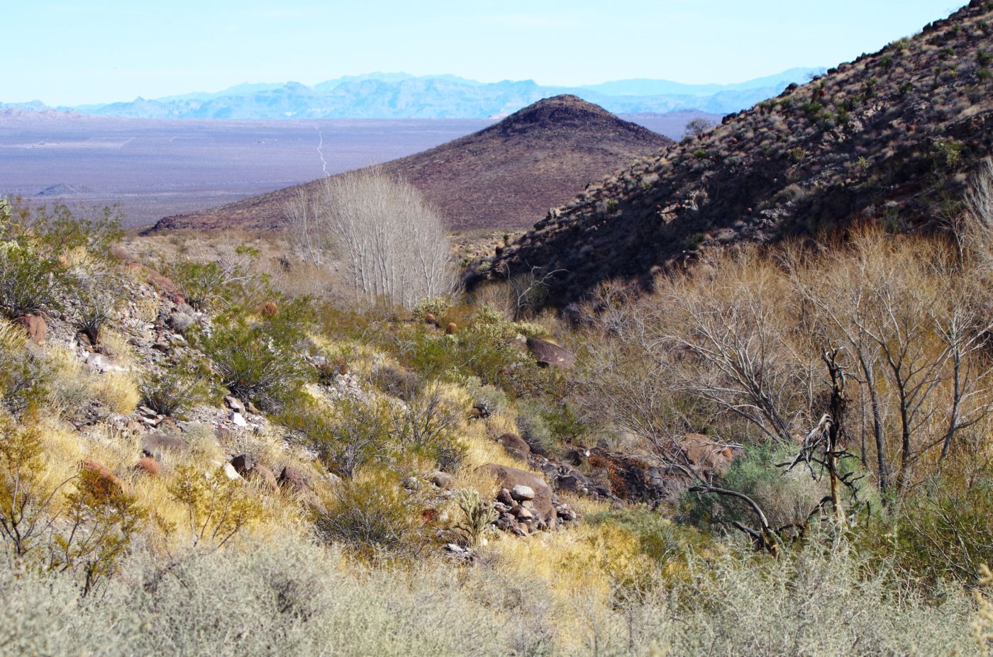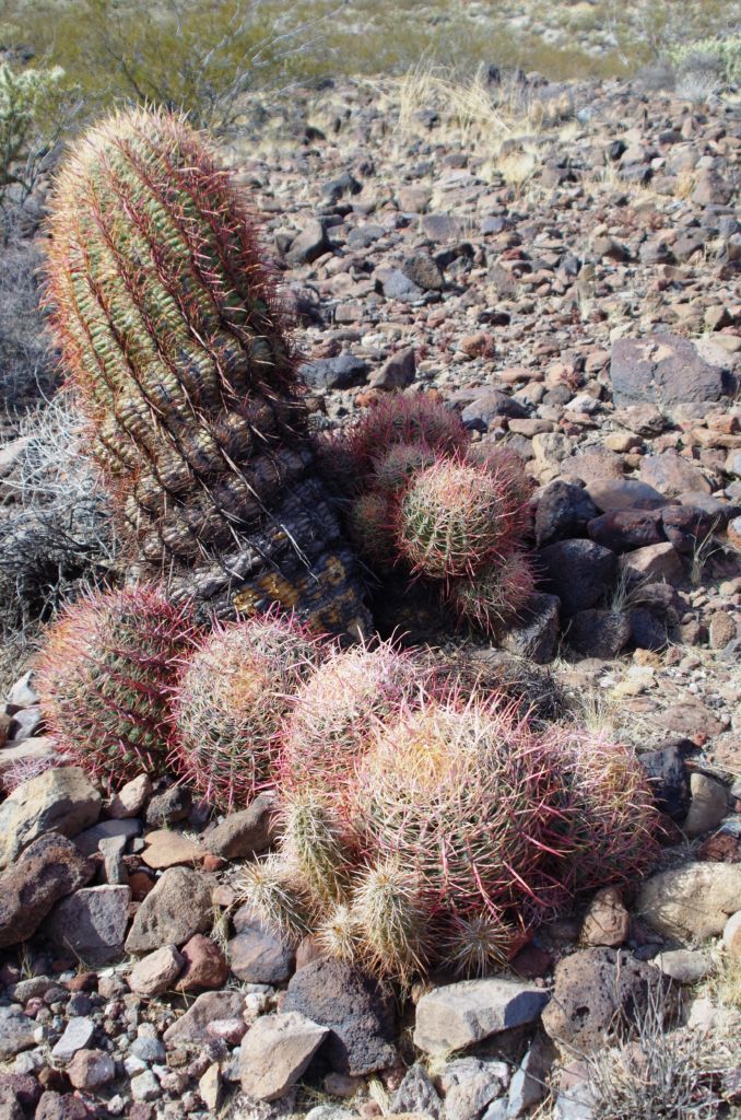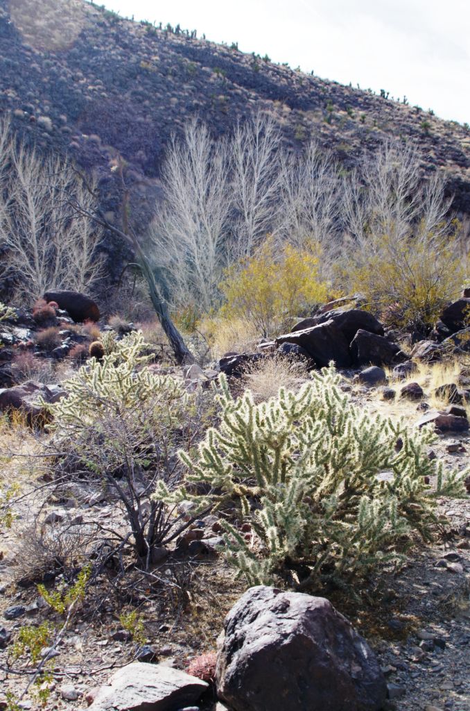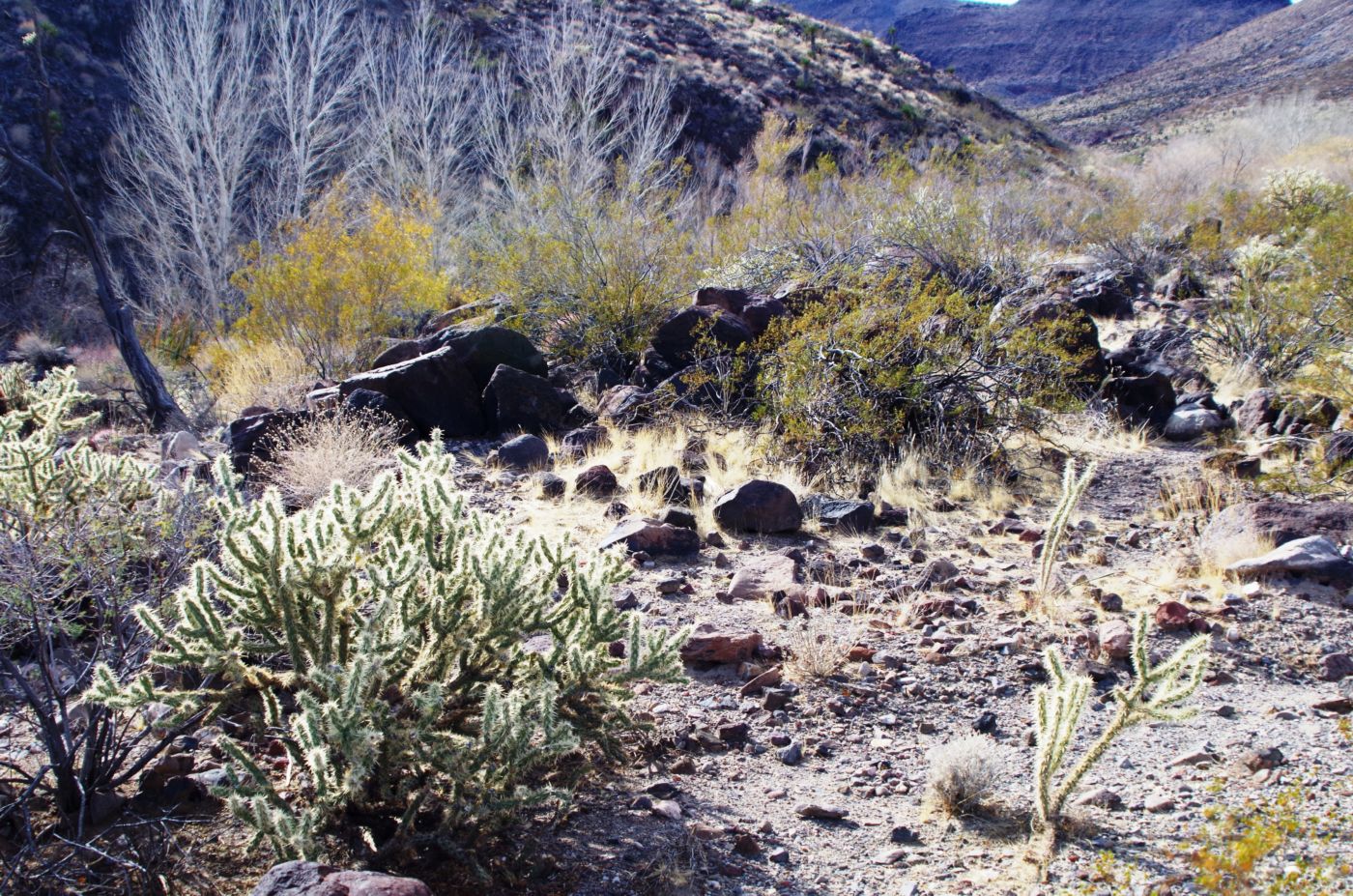 Bob and I picked our way along the trail, looking to the intersection of the trail that should lead back to Wild Horse Canyon Road where we had left my truck and hopefully the provisions for the day as there was some considerable confusion at the parting of the vehicles what and whom went where.  We saw a lone youthful hiker come down from the much longer Gold Valley hike, however watching his progress brought our attention to the older, taller scamps making their way through the cholla, barrel cactus, yucca, and creosote bush.  We considered trying to hide and surprise attack them, but cover was scarce.