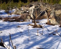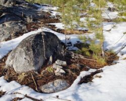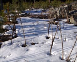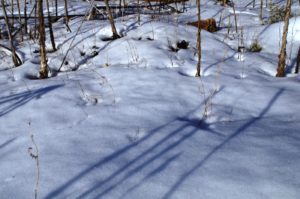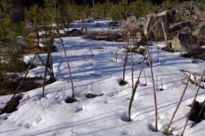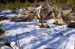 Steve and I came back again to the spot to gather up the cedar trees that had been left along the side of the clearcut. We had noticed them the first time we came, so we made a point of coming back. This early December day, it was so warm, we worked without shirts and BBQ’d in the shade. My stupid brand new saw wouldn’t work so we couldn’t take any wood home, but we did make one pile and elevate many other logs on a stump or rock, to keep them off the ground and above some of the snow.