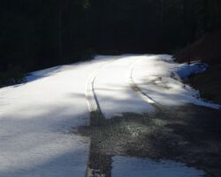 There were good tracks in the snow, and plenty of places where the road was clear, so before long we were at the turnoff for Packsaddle. Again, we had tracks to follow, until we didn’t. We were close, within a mile, so I really wanted to try now. We plowed along. The snow wasn’t deep; we never lost traction, I just don’t like driving in the snow, nor do I like being the first vehicle in and the only vehicle around. We had shovels, and the day was young, so we could get ourselves out of some minimal trouble, but pitched over the edge and down the snowy embankment would be another story.
