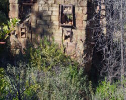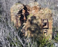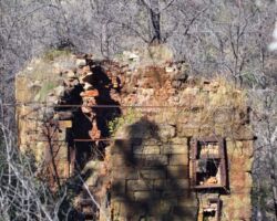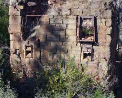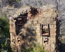 There was a wide spot at the intersection and we took the chance to stop, stretch, unwind, and look about. We found a very cool two or three story square cement block/stone structure below the road on the hillside. It had massive steel threaded rods and nuts on the end projecting a foot or so beyond the walls on each corner. High above the creek on the opposite hill, was a large ruin of something, mine, mill, god knows what. It was huge and rusty and lots of steel was still lying about, but it was high up on the hill. It is only at this minute as I write this that the thought occurs to me that I may have pulled out my binoculars for a better look. Oh well. It was fun to guess and imagine.