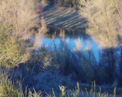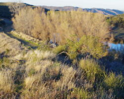 Up top, the road became rock. It was beautiful orange, red, and white, a rock hounds heaven and a place I may have to return, but dropping into Davis creek, the road narrowed to one narrow lane, with significant slides, erosion and numerous sharp turns. The options to turn around were few, so progress forward just had to be steady and slow. Eventually we got to the bottom where Davis Creek enters Davis Reservoir. I noticed this spot as the intersection of one of the maze of roads off Knoxville road that encircled the mine pond up above, that eventually came to this spot, but on googly, I could see a dark line across the road, an indication of a gate or a log or something that, if we could have found our way through all that, may still have prevented us from getting onto Road 40 at this point.