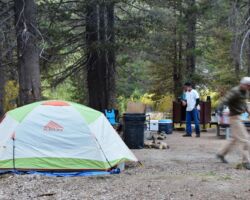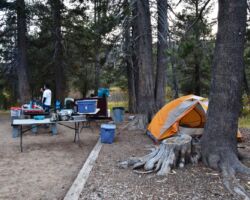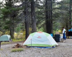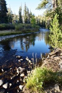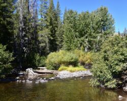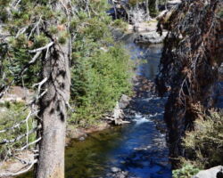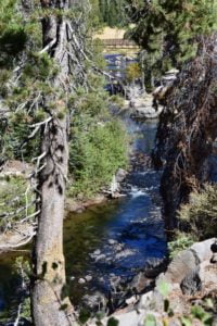 I do recall the insanely steep drive down from the Entrance station at 9176’ down Reds Meadow Road.  It was a thrill every time in each direction, especially when we had to maneuver to pass someone or let them pass us.   We may have checked Minaret Falls and Upper Soda Springs campgrounds first, but they were full.  I recall being relieved, after having driven all this way, and finding the other 2 campgrounds full, to find a nice site along the far upper stretches of the Middle Fork of the San Joaquin River.  I remember the young cute camp hostess greeting us and having a nice talk with her about her experiences out here in the high Sierras.