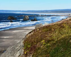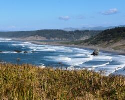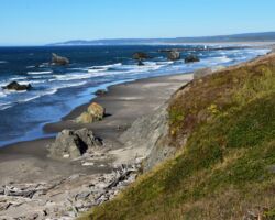 We pretty much rolled through Brookings and Gold Beach, although we had a momentary temptation to take Jerry’s Jet Boats up the Rogue. We stopped for groceries in Port Orford, but we were excited to get to our campsite at Cape Blanco State Park. As has been our experience with the Oregon State Parks, it was just as advertised, and despite the great weather, fairly scarcely occupied. We set up camp, then took a stroll out to the beach before we settled in for the night.