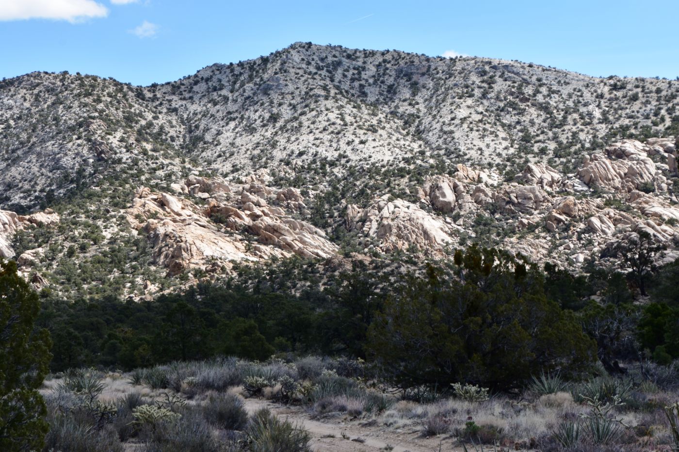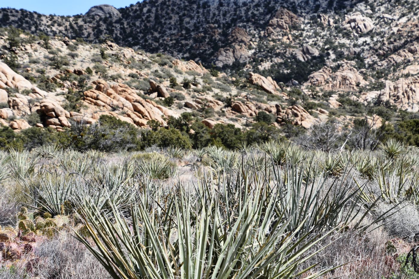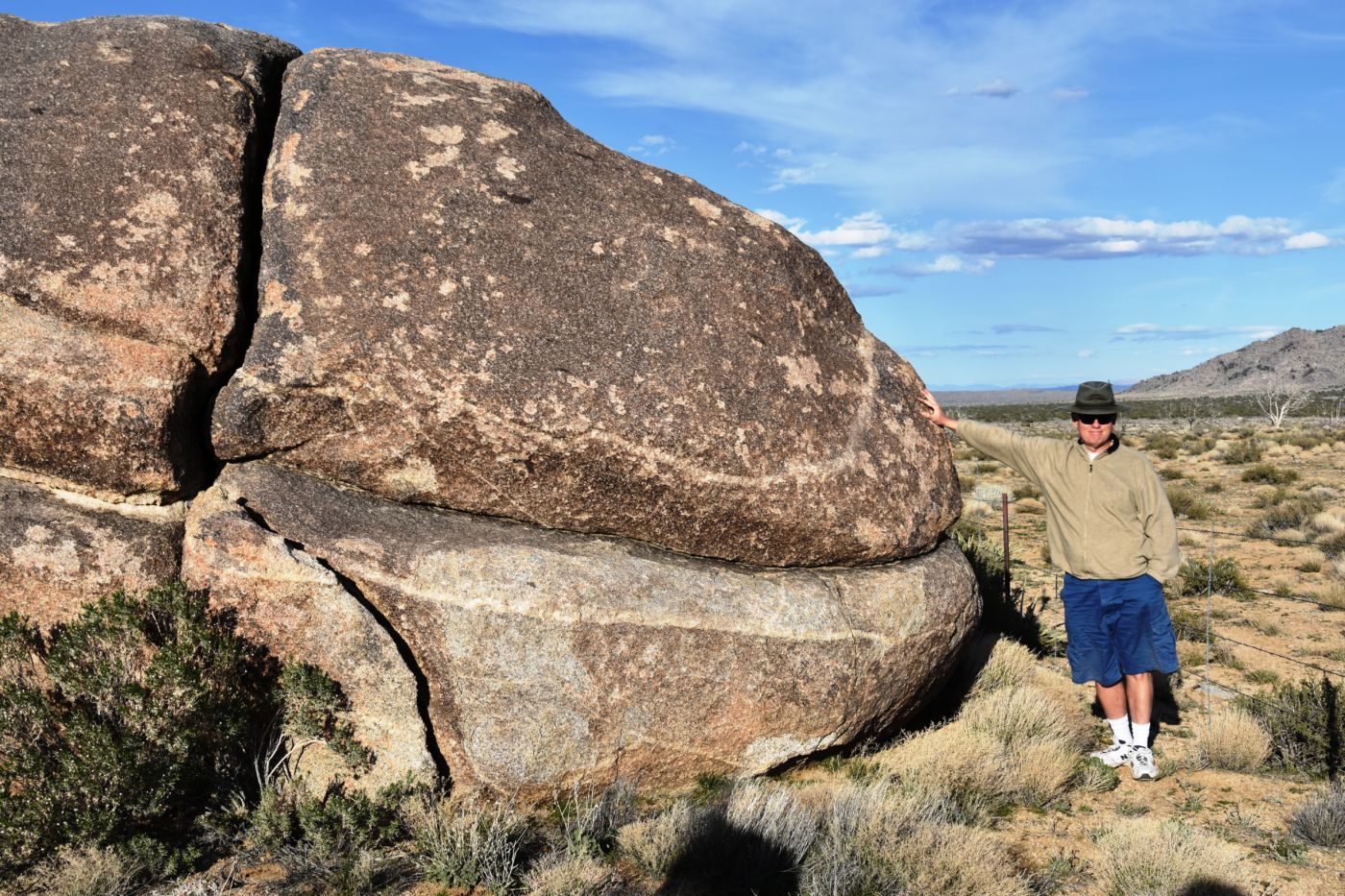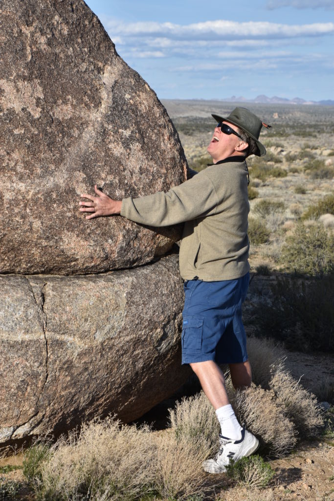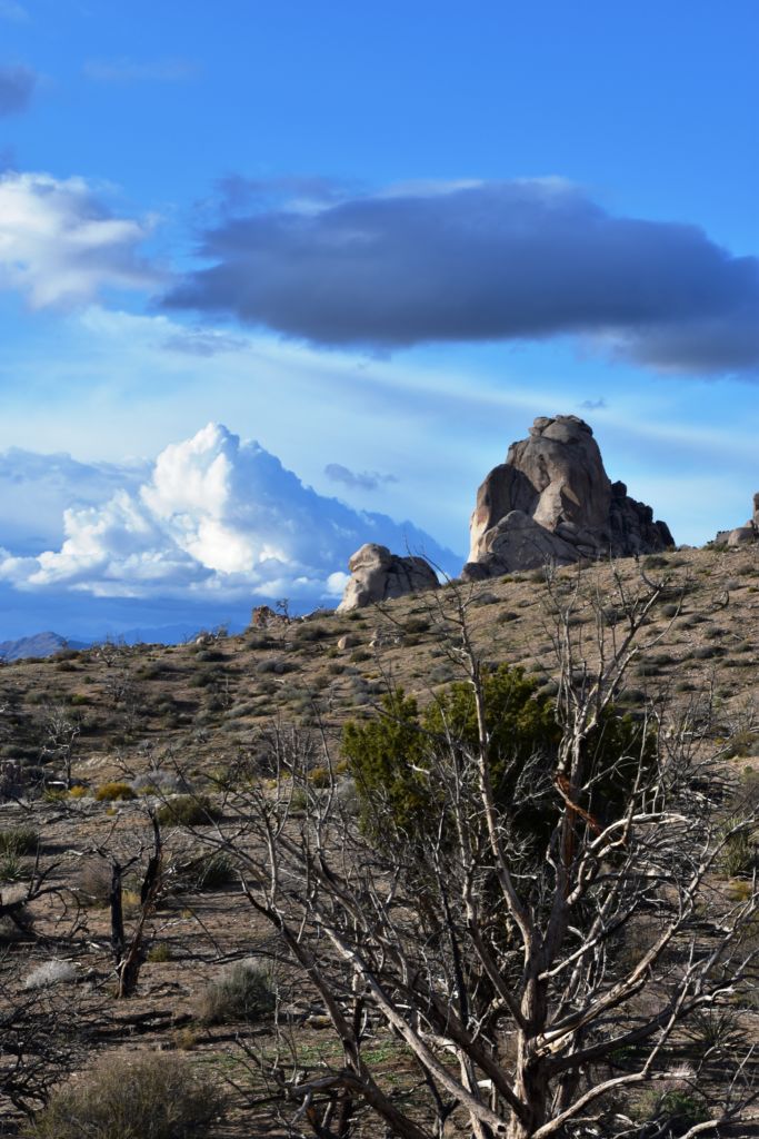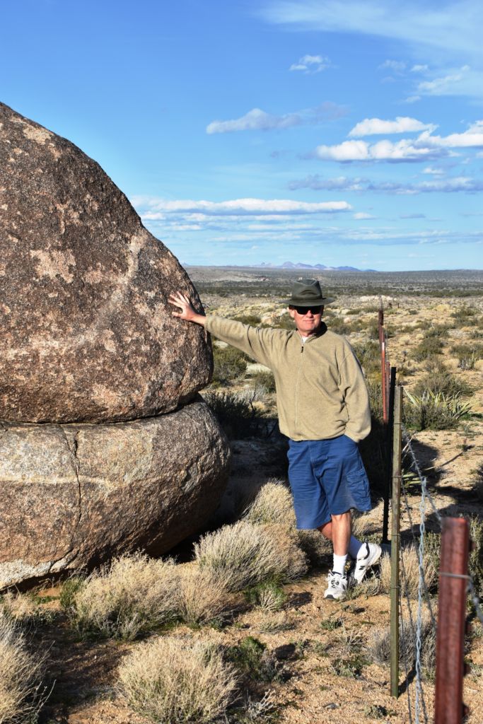 Once we turned around, Tom made a few exploratory runs down fence-line roads.  We were nearly back to the intersection of Black Canyon Road which we often drove last year back to our camp.  It led to Mid-Hills campground which at least was a destination.  So off we went, searching for side roads along the way.  There was one truck camped amidst a huge boulder pile which was a great site, but that was about the only site we saw before the campground.  Reluctantly, we pulled into the loop, seeing a few occupied sites, but overall, almost as empty as it has been on our previous trips through.  That was to abruptly change.
