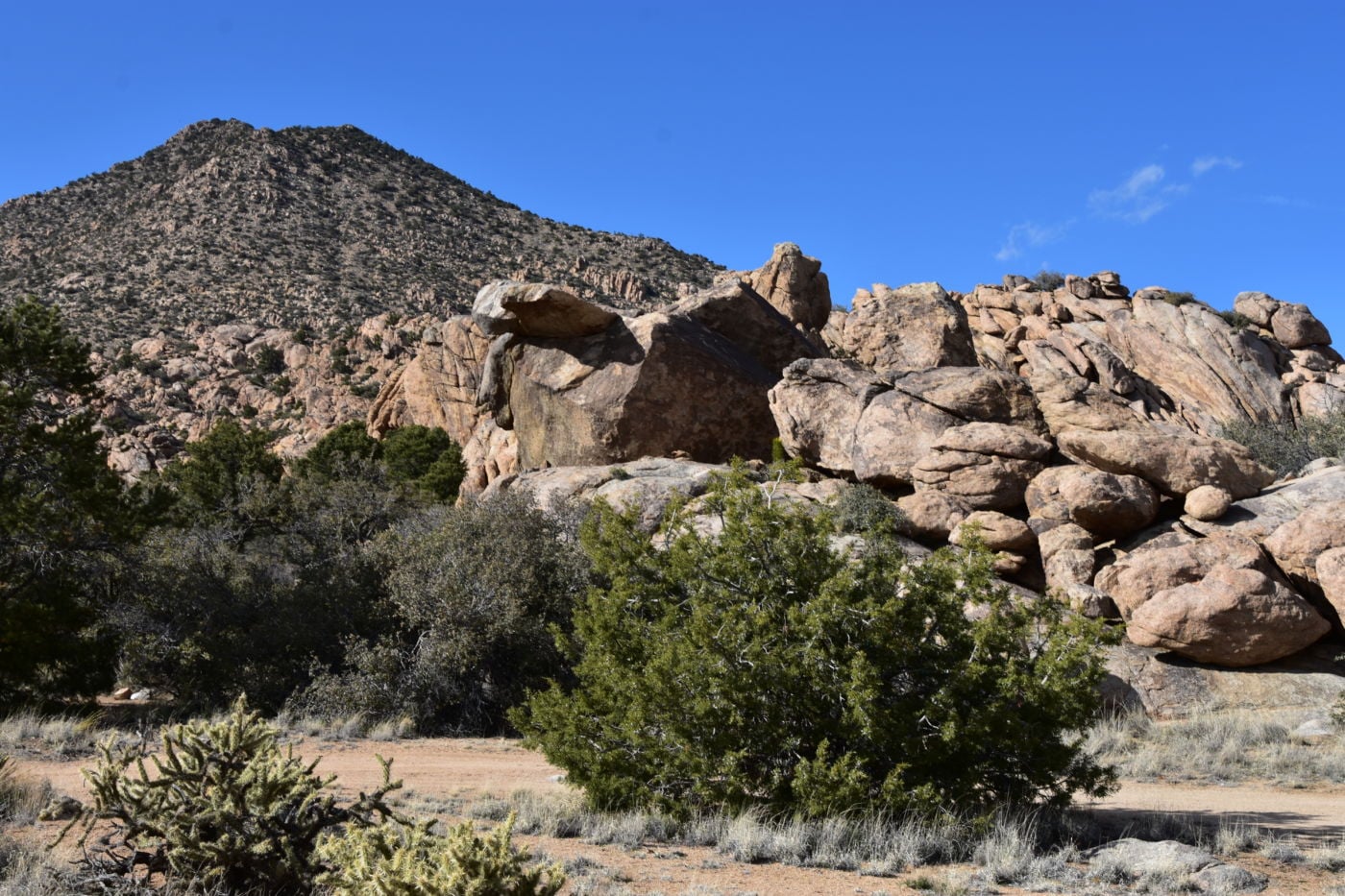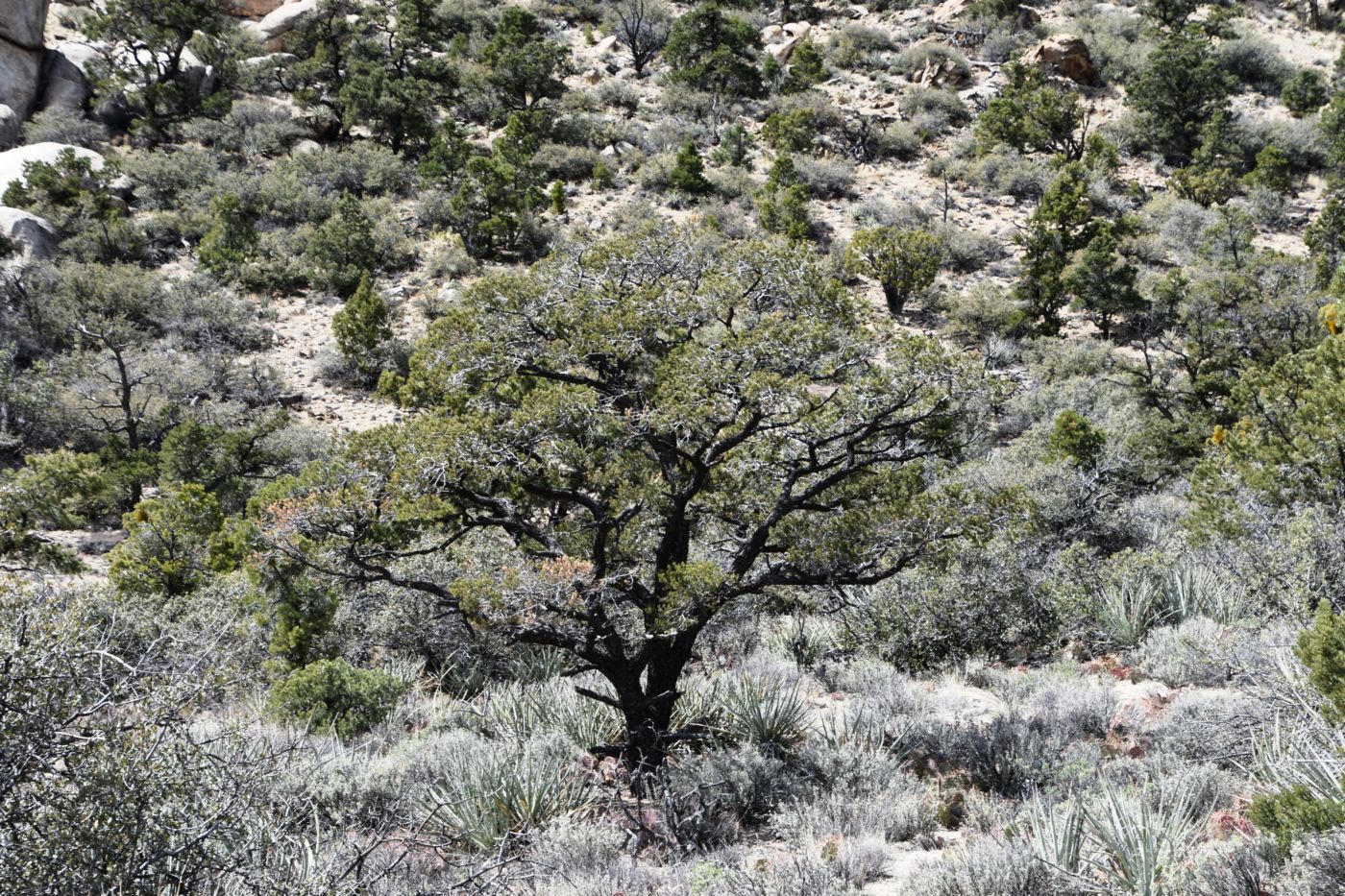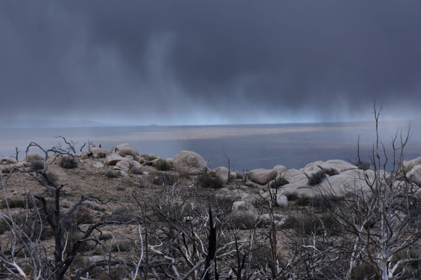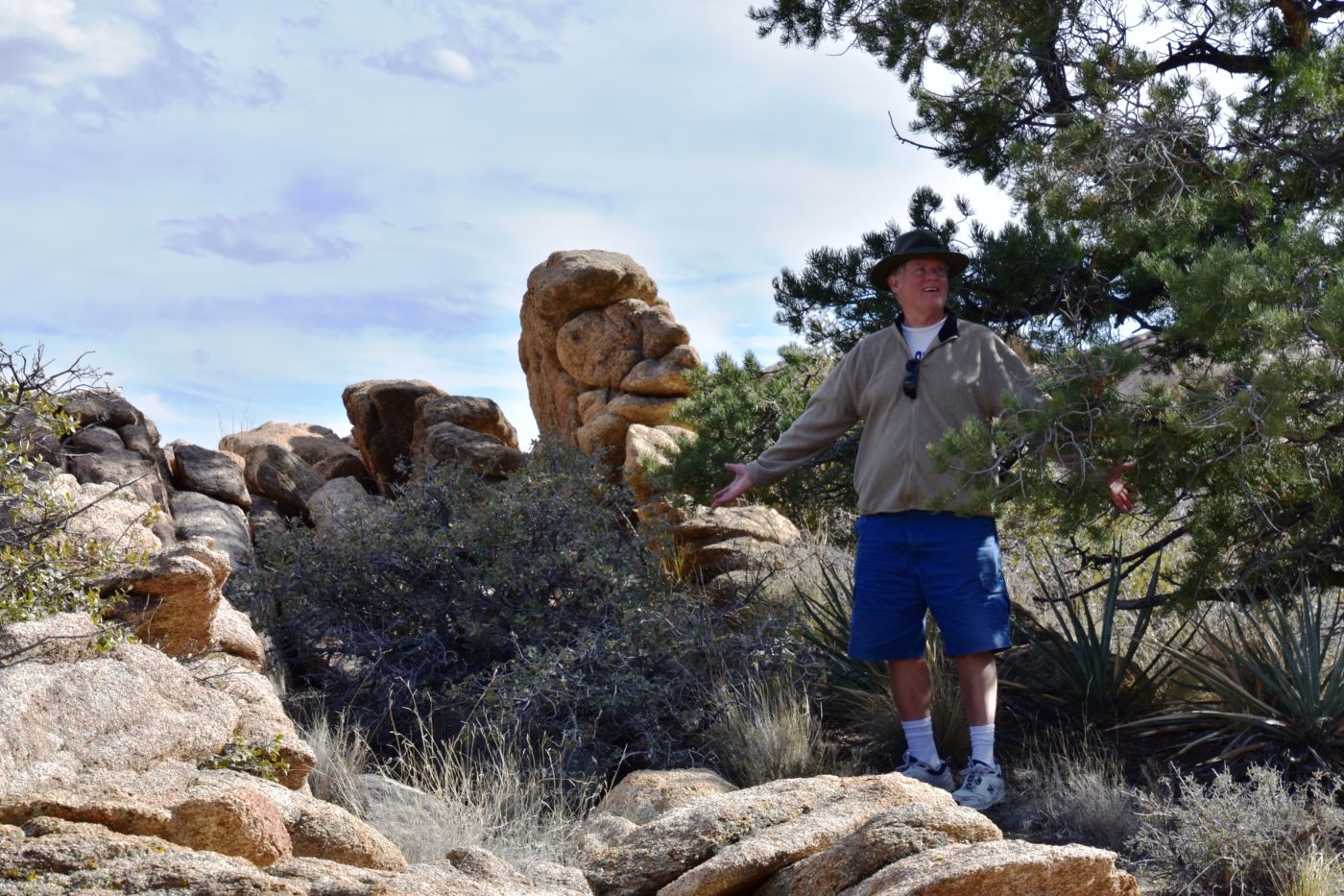 Once we turned around, Tom made a few exploratory runs down fence-line roads.  We were nearly back to the intersection of Black Canyon Road which we often drove last year back to our camp.  It led to Mid-Hills campground which at least was a destination.  So off we went, searching for side roads along the way.  There was one truck camped amidst a huge boulder pile which was a great site, but that was about the only site we saw before the campground.  Reluctantly, we pulled into the loop, seeing a few occupied sites, but overall, almost as empty as it has been on our previous trips through.  That was to abruptly change.