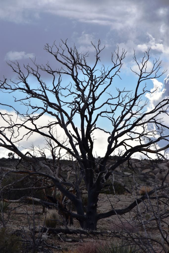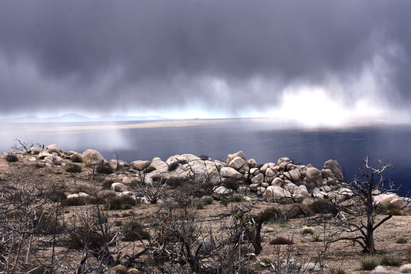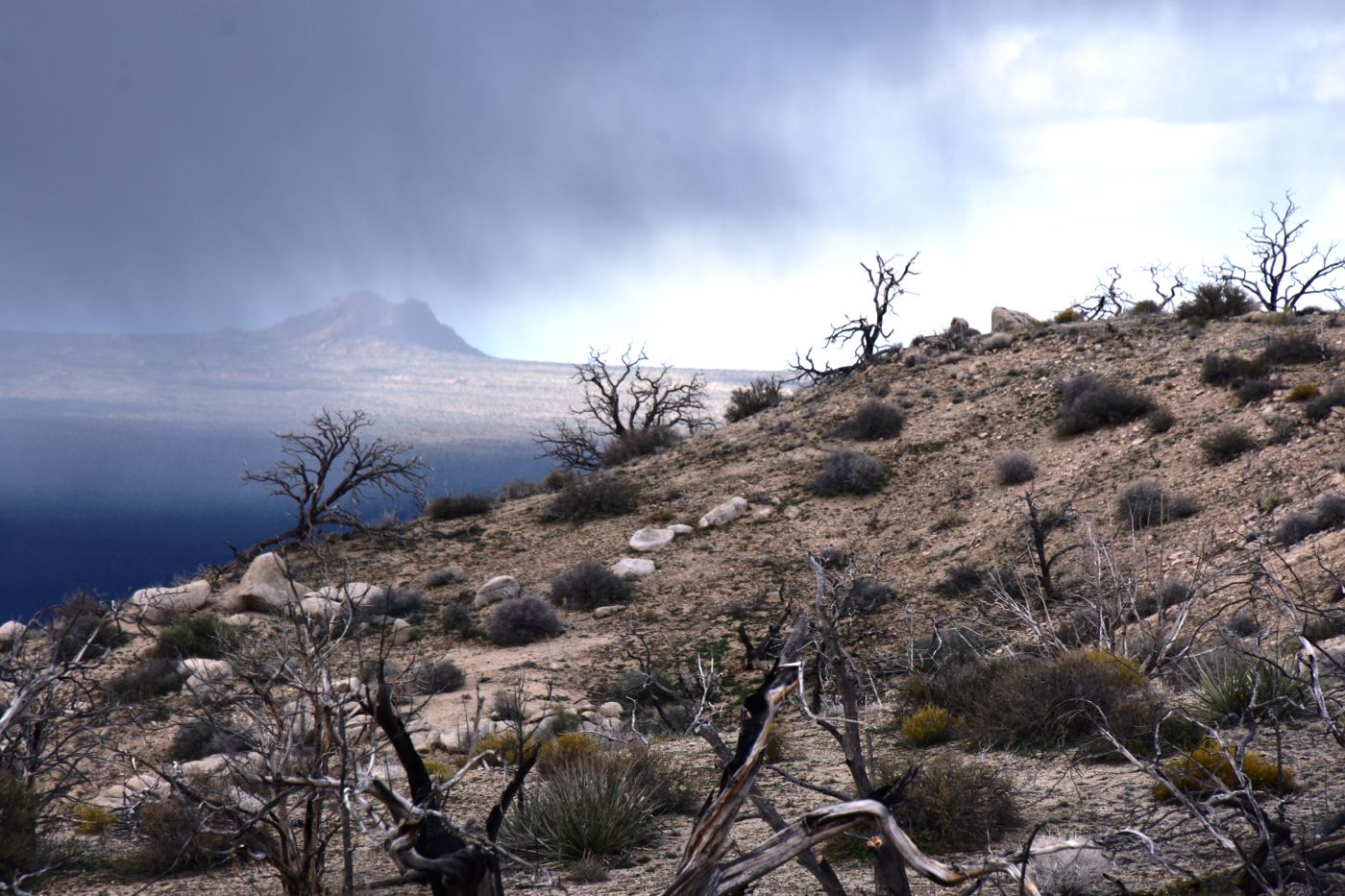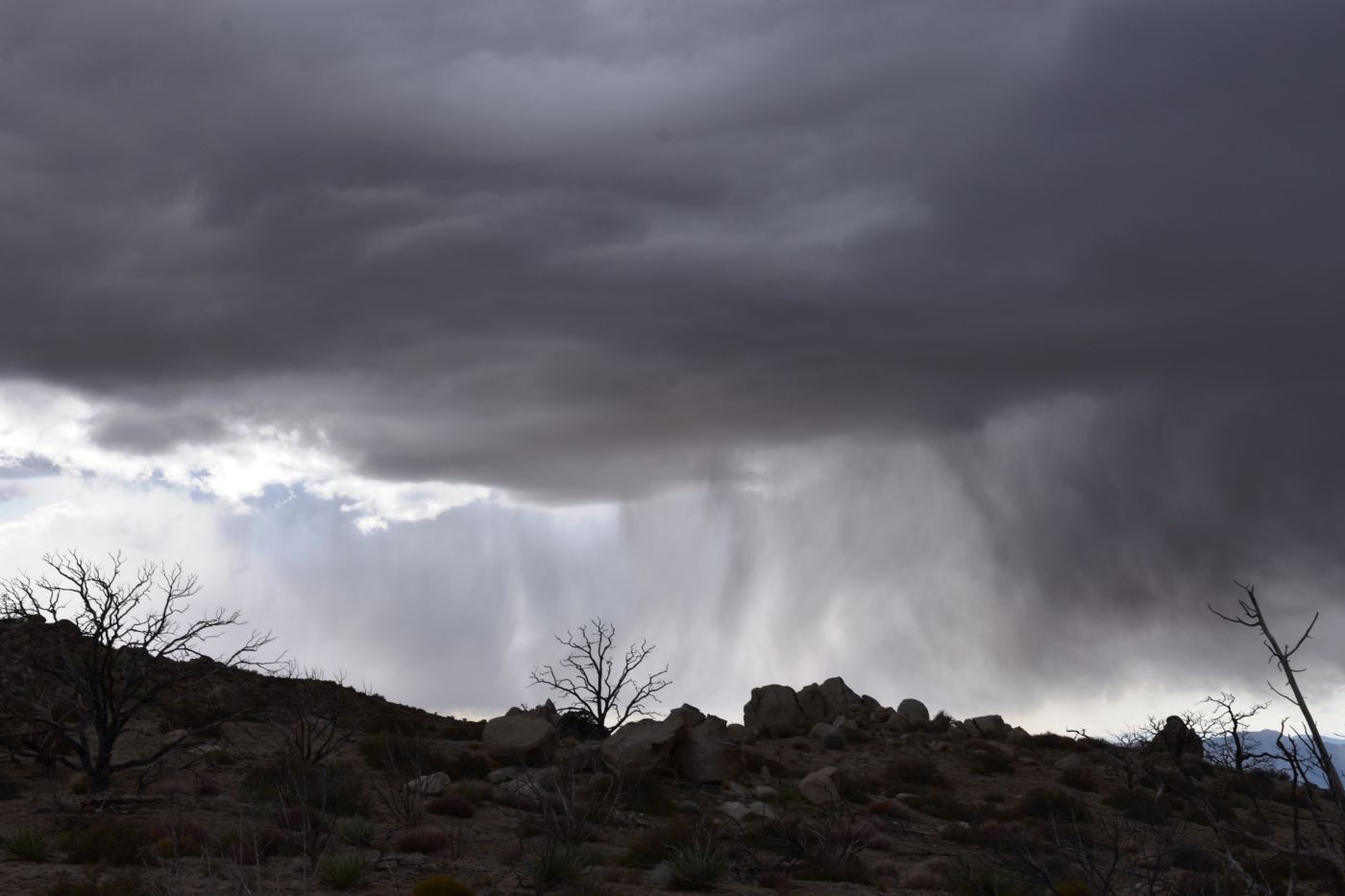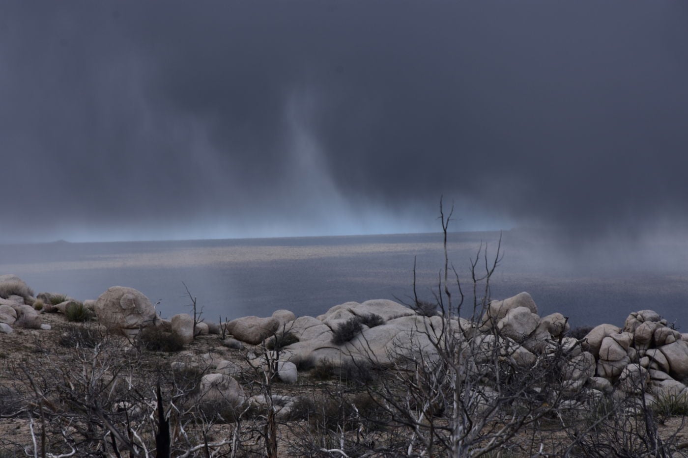 Once we turned around, Tom made a few exploratory runs down fence-line roads.  We were nearly back to the intersection of Black Canyon Road which we often drove last year back to our camp.  It led to Mid-Hills campground which at least was a destination.  So off we went, searching for side roads along the way.  There was one truck camped amidst a huge boulder pile which was a great site, but that was about the only site we saw before the campground.  Reluctantly, we pulled into the loop, seeing a few occupied sites, but overall, almost as empty as it has been on our previous trips through.  That was to abruptly change.