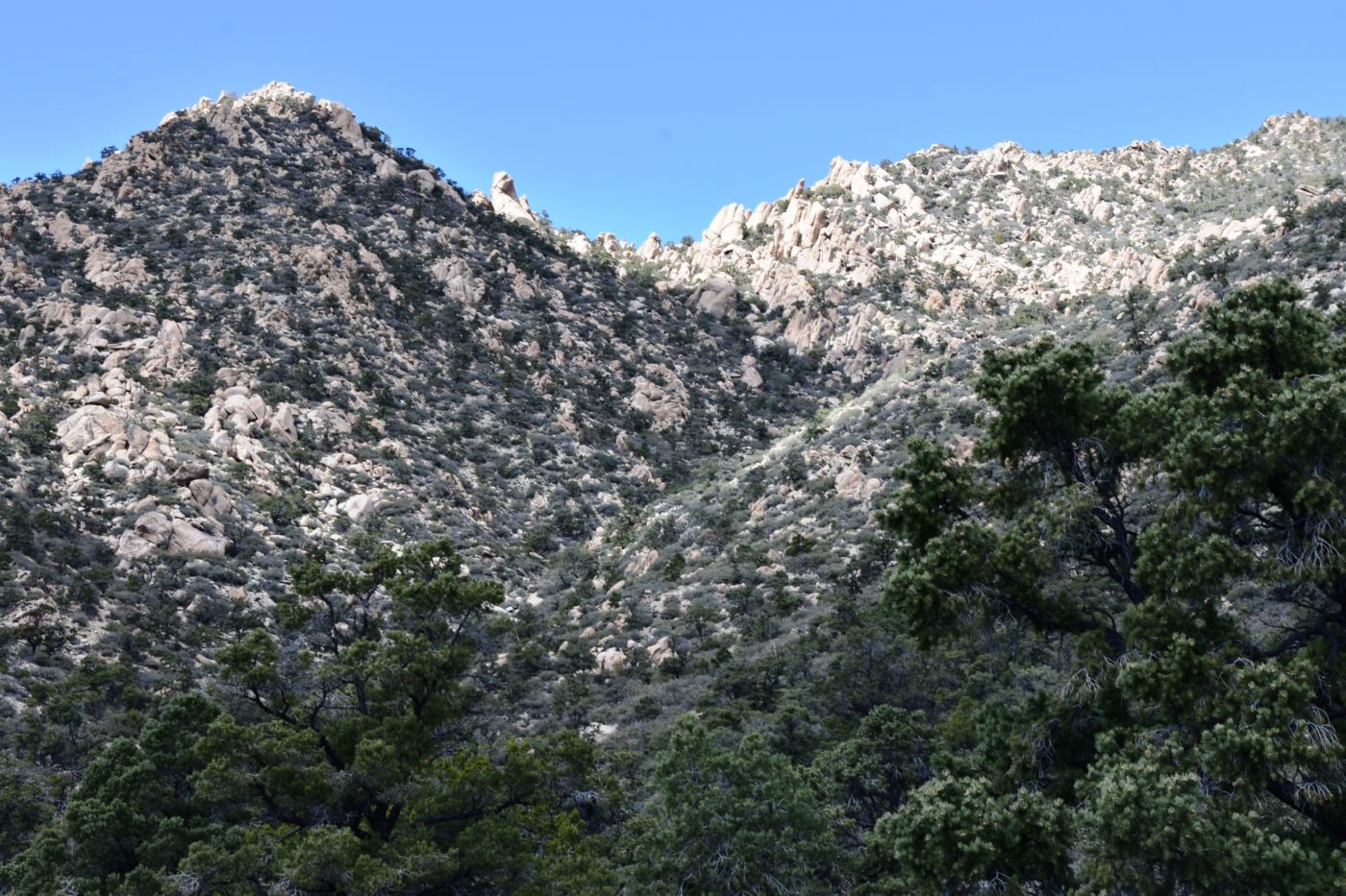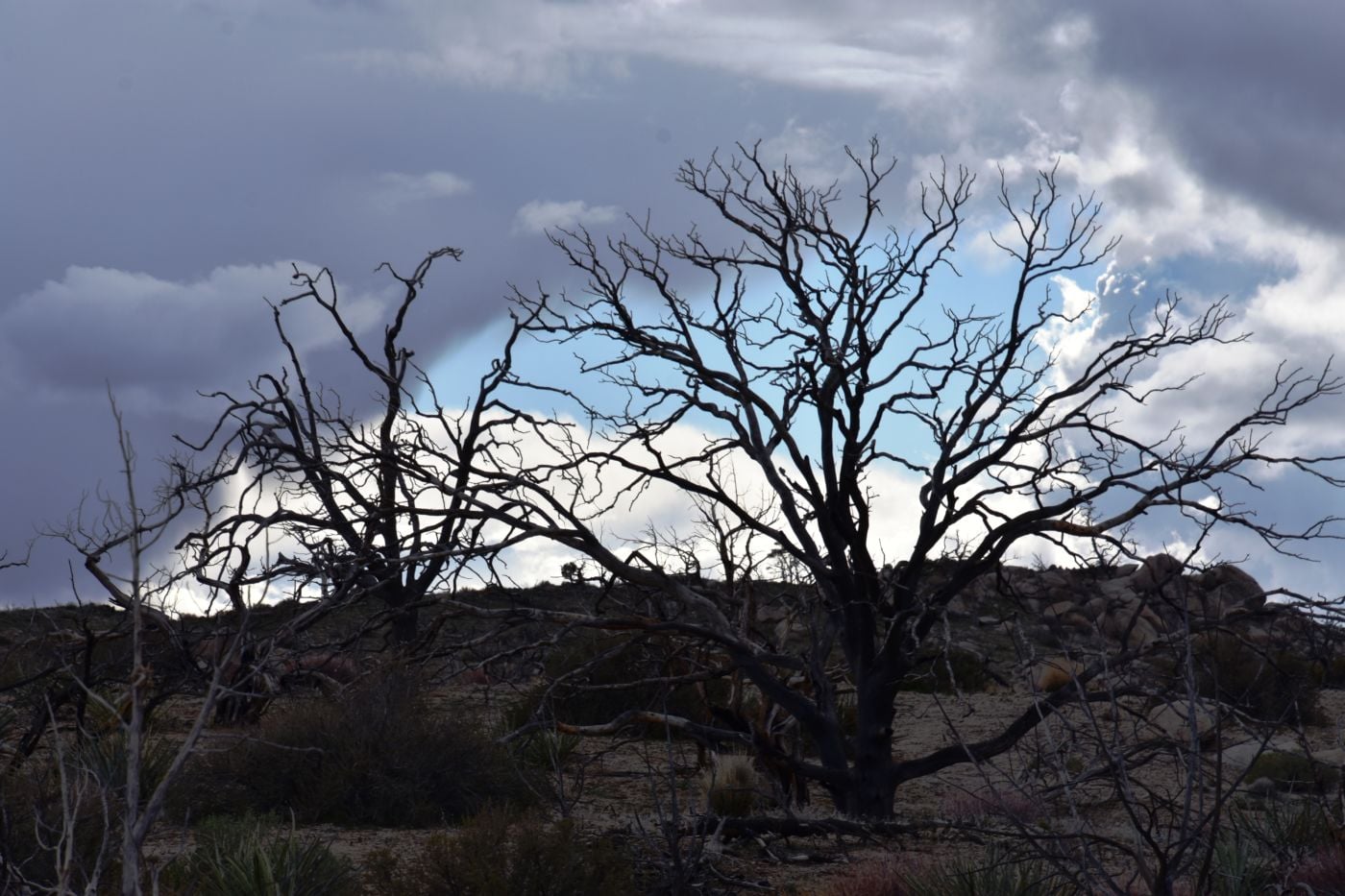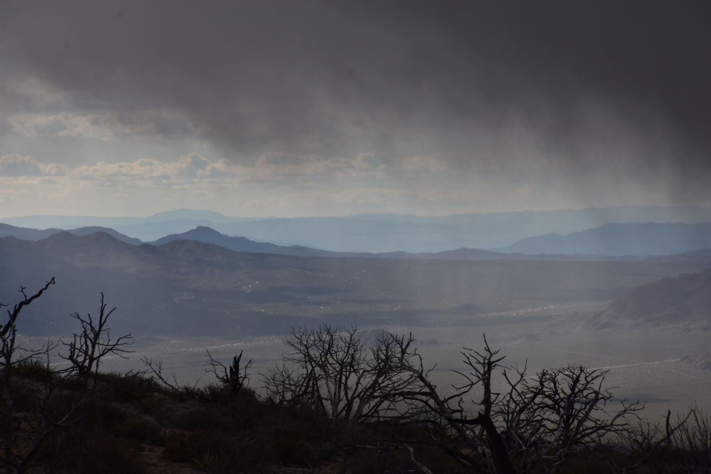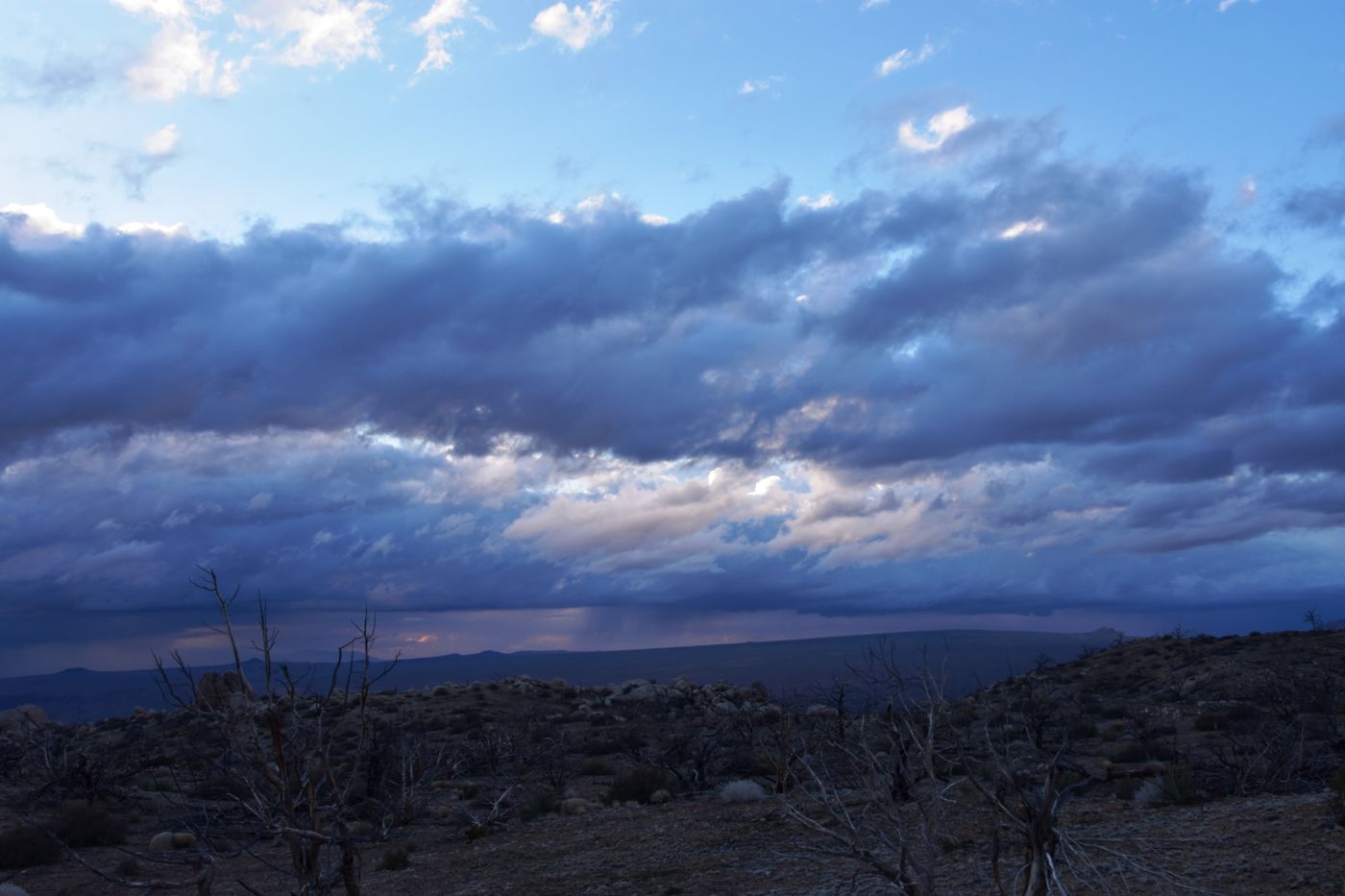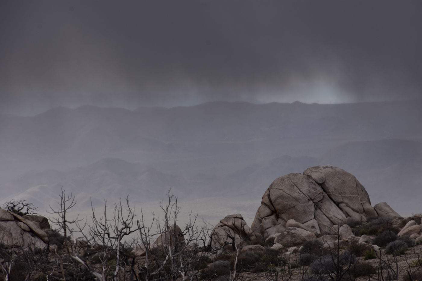 Once we turned around, Tom made a few exploratory runs down fence-line roads.  We were nearly back to the intersection of Black Canyon Road which we often drove last year back to our camp.  It led to Mid-Hills campground which at least was a destination.  So off we went, searching for side roads along the way.  There was one truck camped amidst a huge boulder pile which was a great site, but that was about the only site we saw before the campground.  Reluctantly, we pulled into the loop, seeing a few occupied sites, but overall, almost as empty as it has been on our previous trips through.  That was to abruptly change.