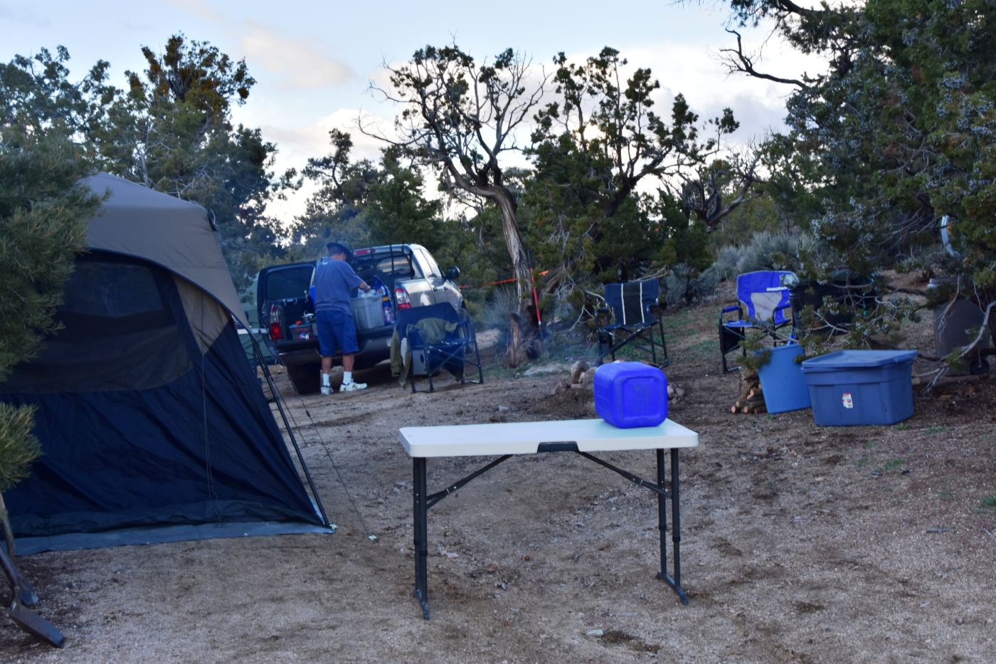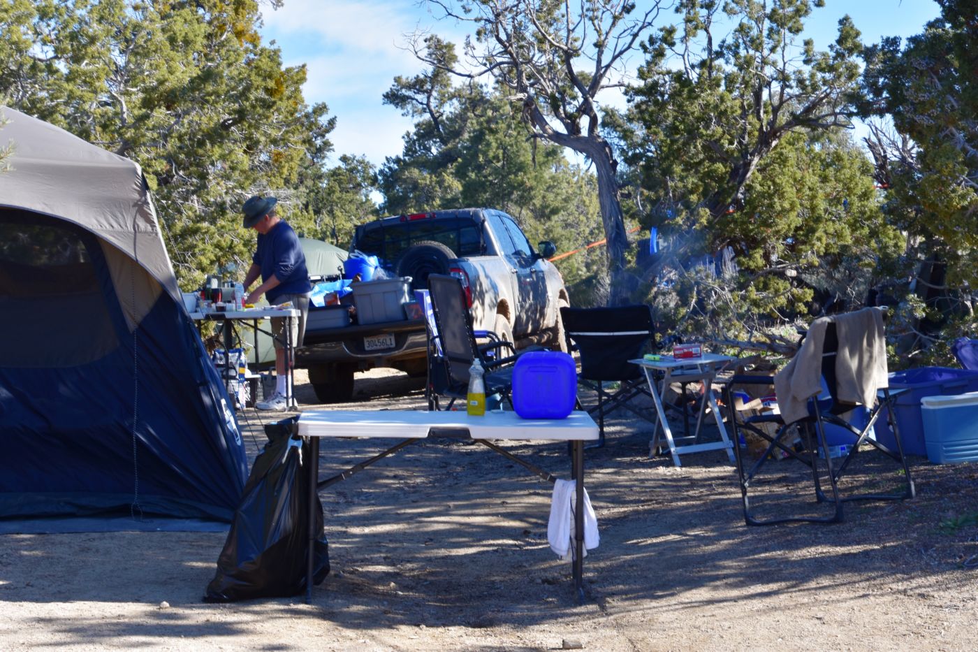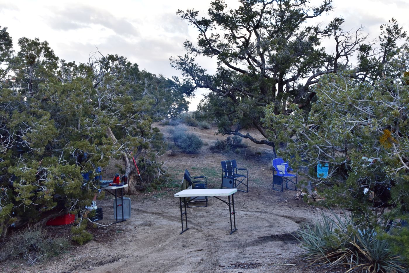 I took another drive around the loop and Bill took another drive around the loop, but we couldn’t find the porthole to the sweet spot, so we wished we could find a great spot without neighbors, with a great view, down an accessible road, with plenty of room, and off we went.  Bill stayed behind to keep our space and Tom and I left the campground and headed down Wild Horse Canyon Road in search of options.  We hadn’t gone a mile when the truck turned right and up a descent little track we went.  We turned left and rose up a steep pitch to arrive at our spot.  It was just as we had wished.
