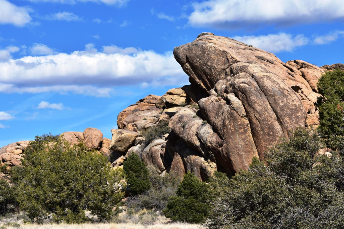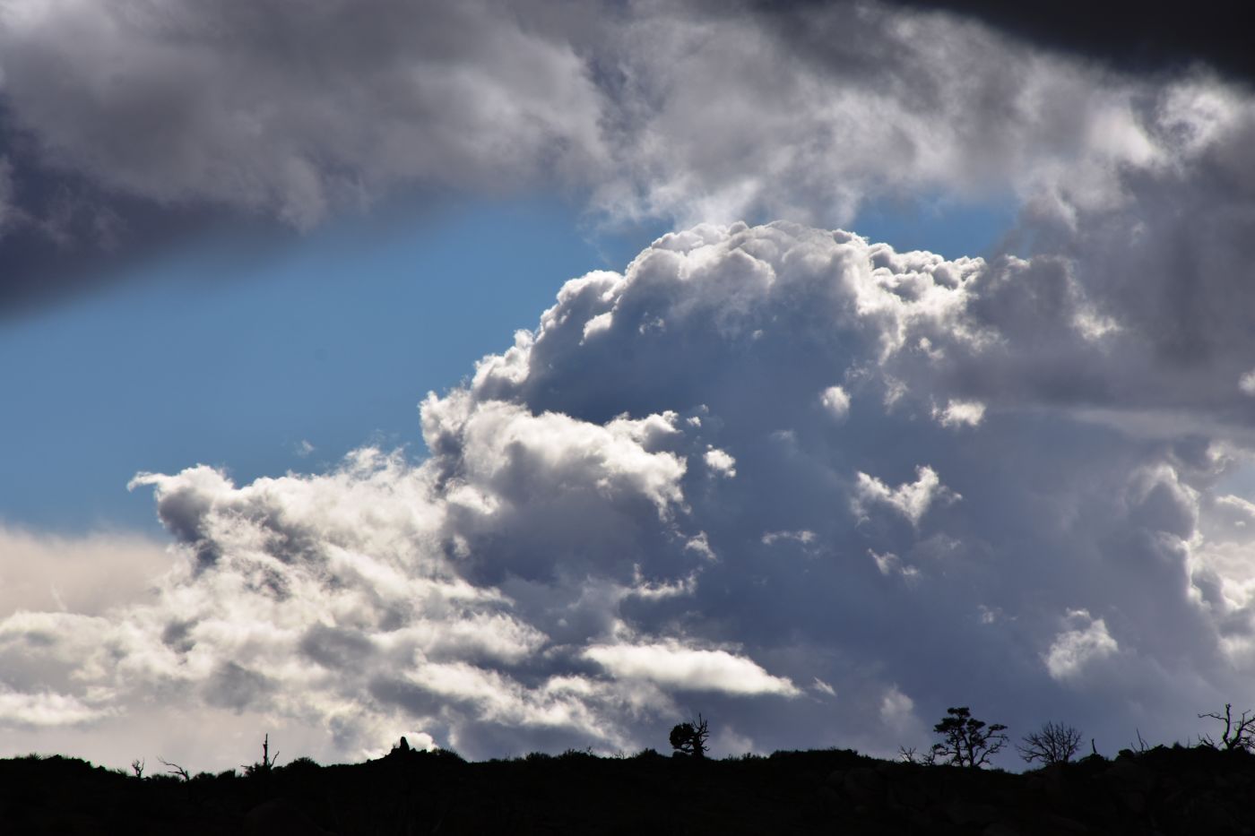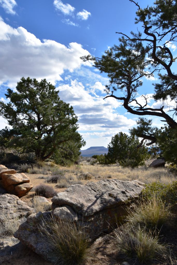 I picked my way through the beach ball sized field and into the larger VW bug sized boulders and on through to the full sized pick-up rocks that seemed to line the edge of the hill.  There was a dead Juniper that had perfectly formed in front of, and below, the large balancing rock, growing in a horizontal form, blocking access to getting up into the cave that had been formed.  It turned out the balancing rock was not at all, as we were looking at the front edge of a massive boulder reaching far down the hill and only partially resting on the flat stone below.  I carefully scrambled around the sharp pointy branch tips of the Juniper sculpture and hopped up onto the flat bed.  Unfortunately, its surface was very rough and pointy, as if the City had put sharp points on the park bench to prevent the homeless from sitting.  I laid down nonetheless and stared up at the speeding sky.  There was so much motion, it almost made me dizzy.  I sat up to partake of my last beverage.