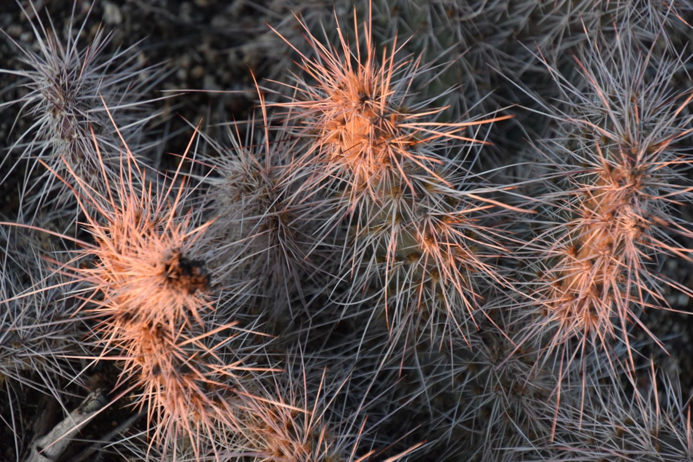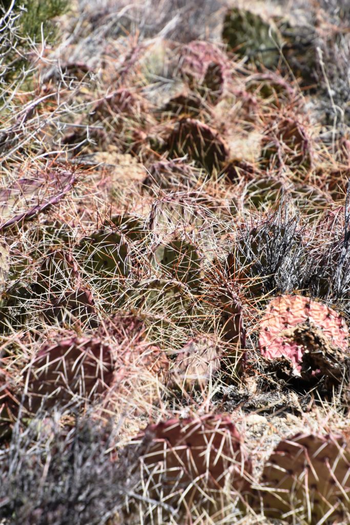 We dropped into a large arroyo, then some rough road, and up the other side.  I could recall the images from Googly that we were getting close to the final leg up into Caruthers Canyon where the numerous dispersed camp sites were, but my excitement got the better of me, not remembering to try all the side roads and investigate potential future sites, but rather scurrying down the road to find the end.  We did find the end of the road, unlike in past trips, and we debarked to see what was about us.  We were way up inside Caruthers, surrounded on the floor by dense clumps of cacti and boulder strewn hillsides all the way up to the higher peaks at near 7500’.  This was quite a place.