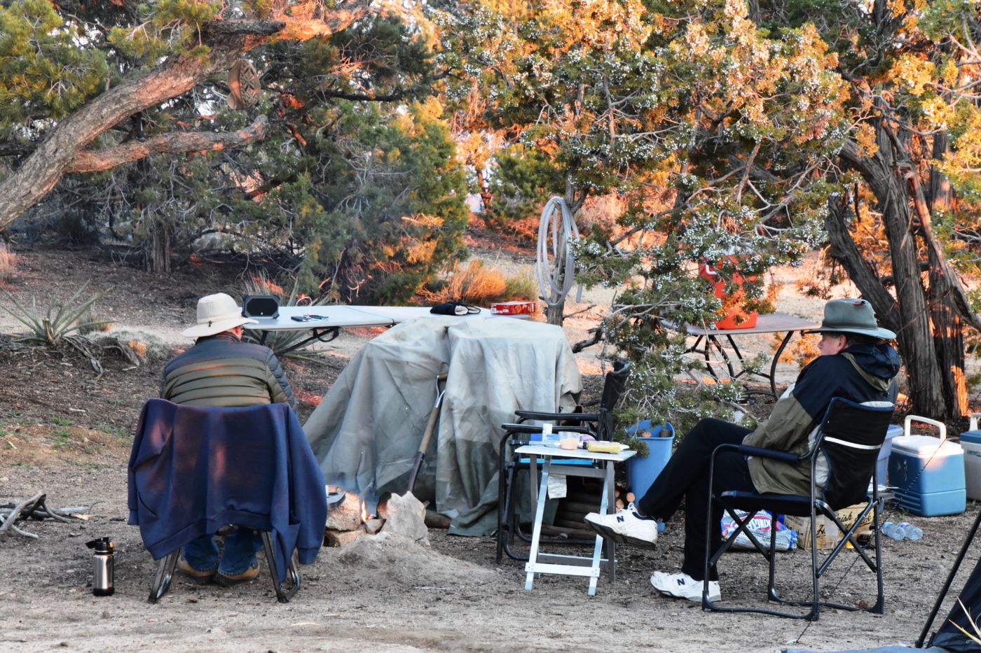We ventured beyond the end of the road to the base of the most prominent rock formation and sat in the sun, out of the breeze as much as possible.  We could hear the boys’ voices from out across the boulder field, but we couldn’t see them.  It was time to return to camp, but I lingered behind Tom and Bill, sure that I would eventually see them pop out from behind a rock or rise above a hill below.  I kept hearing their voices, just a word or two and certainly each explosive burst of laughter, but I never saw them.  I cut down off the road to a route I thought they might take back to camp, but we didn’t intersect.  I got to the fire and reheating my root/pork roast brew.