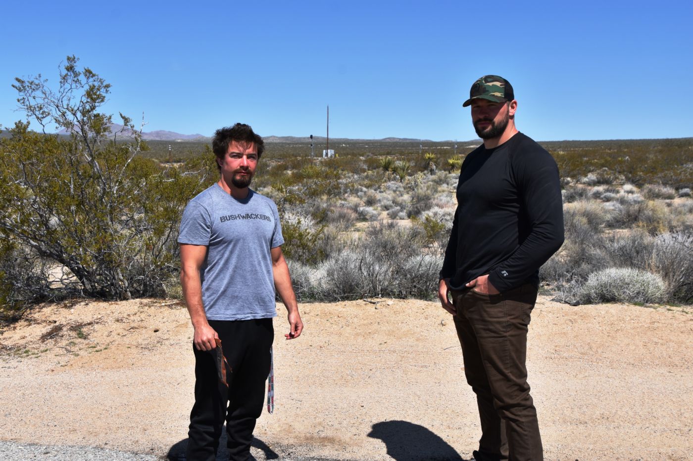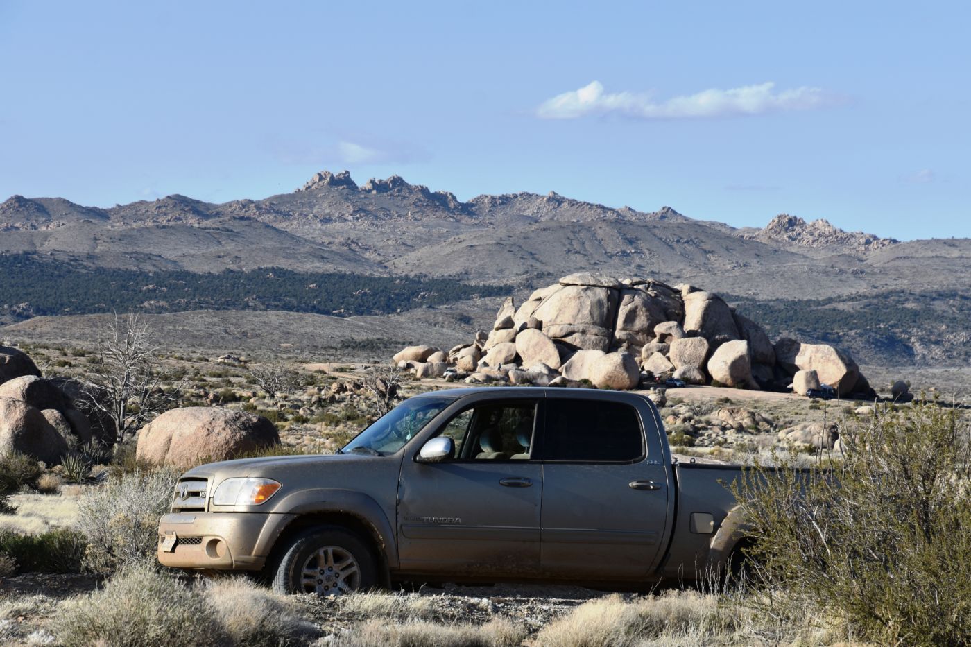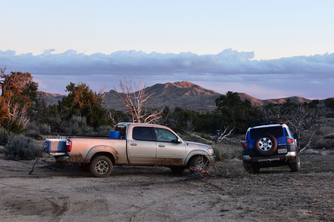 I changed into my SpongeBob bed clothes and slept extremely well.  I awoke fresh as a daisy and excited to meet up with Jordan.  We had agreed to meet at 11:00 in Cima, or really at the intersection of Cima Road, Cima-Kelso Road, and Morningstar Mine Road, as Cima isn’t really a community any more.  After delicious coffee and fire, we headed out about 10:00 and found that, with the sun and the wind, the roads had dried out really well, so not knowing what kind of vehicles Jordan or David were driving, I was confident they would make it into camp.  We got to the intersection and there was a huge guy standing next to a brand new Tacoma.  I gave him a long look as I pulled up near him.  Thank god it was David.