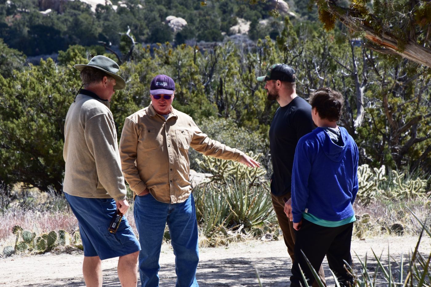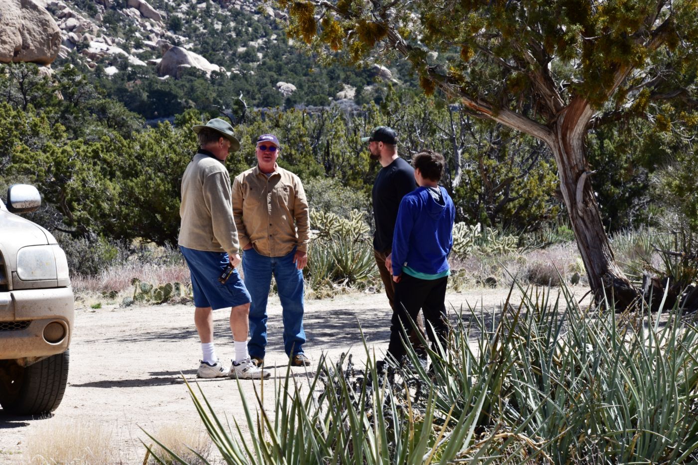 The boys of course were anxious to explore and the elder folks were quite content not to.  Jordan and David loaded up smoked salmon, cheese and crackers, plenty of liquid, and headed up.  I repositioned the truck in partial sun/shade, put on some tunes, and pulled out the ice chests for lounging.  Bill, Tom, and I had a great time just chatting, and peeing, and wondering where the boys were.  It was great fun for a while, but I was getting a tad anxious to see a few more sites on our way back, and get back in plenty of time for our final night.  We left a note on the windshield and headed back, stopping at a small pit I had seen on Googly and gathering a few fine specimens.