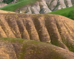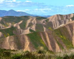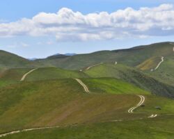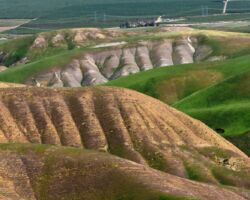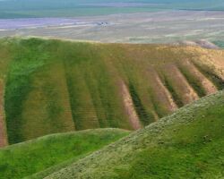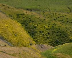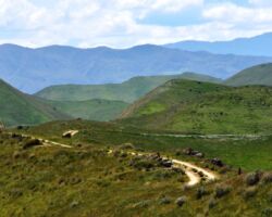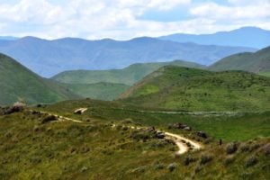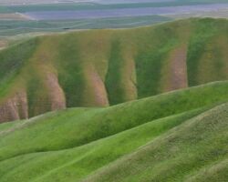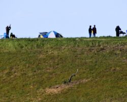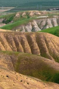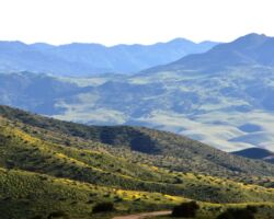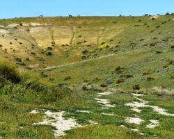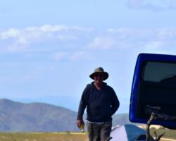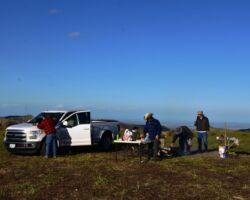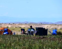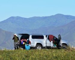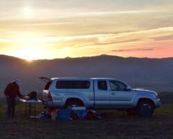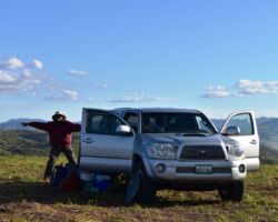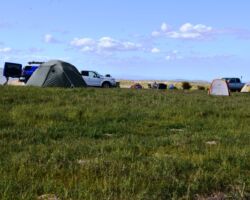Sure enough, Road P12 is marked by a huge white road sign; not that it says P12, but the big white sign was sign enough. Almost certain now that this was the road they were camped on, I proceeded over hill and dale, and arrived at the hilltop covered by rigs and scattered tents. Home at last. No sooner had the boys greeted me, Rhino and Steve rammed into camp; all accounted for. The weather called for consistent winds so I was concerned about being on the very top of this knoll, but the boys were already bedded down, so a more protected site was out of the question. Being little more than a grassy hilltop, I had plenty of options to set up on the outer limit and oriented my truck alongside the tent as best I could to block some portion of the breeze.