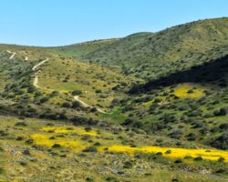 I did figure out that standing right next to the entrance sign I could get connection, so I called 3 or 4 guys and sent a text or 2. Eventually I got a response that said, and I quote, “We are up on a hill probably North of where you camped last time”. Huh? The place is nothing but hills, and where we camped last time no one has any idea. Each road and spur is numbered; that might have been a clue. How far in from the pavement or from the informational kiosk you drove by on the way in. My tracking skills might have handled that one. But hill to the North was beyond my capabilities. However, I did have my binoculars and my intuition said South, so sure as shit, there they be, perched on a hill within my oculars. Now, how to get there?