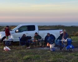 We didn’t tie into any of the provisions we brought on our excursion, so I was hankering for grub when we got back. We got the fire going and soon the grill was again covered in meat; giant pork chops, more chicken, and Vinny made an outstanding skittle of pasta, onion, peppers, sausage, and chicken. I didn’t find it until well after the main course, so I may have been eating it by the handful, but I do remember it was very tasty. Vinny pulled his truck around to block some of the breeze and amplify tunes. The stars obliged, the fire provided, the boys partied on. It was a great night full of lore, laughter, larder, and libations…and sheep.