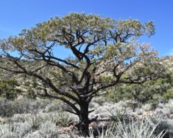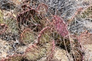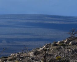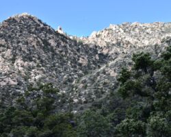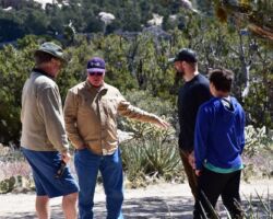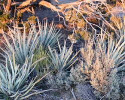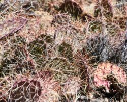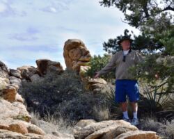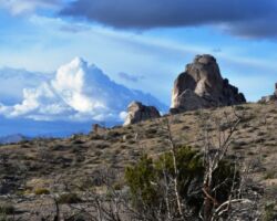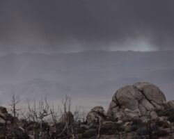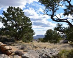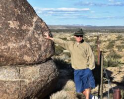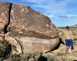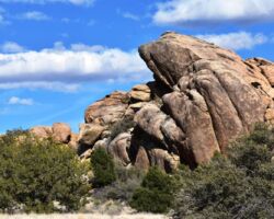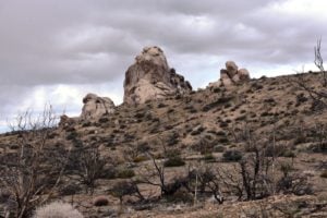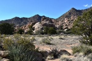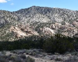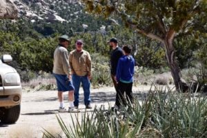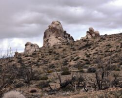 Once we turned around, Tom made a few exploratory runs down fence-line roads. We were nearly back to the intersection of Black Canyon Road which we often drove last year back to our camp. It led to Mid-Hills campground which at least was a destination. So off we went, searching for side roads along the way. There was one truck camped amidst a huge boulder pile which was a great site, but that was about the only site we saw before the campground. Reluctantly, we pulled into the loop, seeing a few occupied sites, but overall, almost as empty as it has been on our previous trips through. That was to abruptly change.