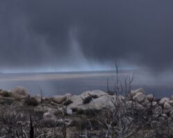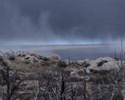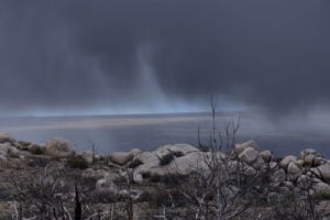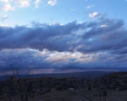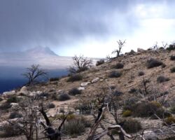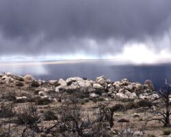 The wind was bringing dark clouds, flat bottomed rain buckets, virga veils in all directions, incredible light, shadow, blue and black, skies angry and comforting. It was quite a skirmish that seemed to encircle our position, but the nipple parted the clouds and kept our path back and our camp clear. I lingered on the rise for a bit after Tom and Bill headed back. It was glorious to watch the clouds and the moisture and the light and the dark and feel the cold but not be affected by it. Eventually I let go of the nipple and headed to a boulder field below, one that we could see from camp. On the way up, we noticed a balancing rock alongside a flat lounge shaped one I was wanting to lay down on.