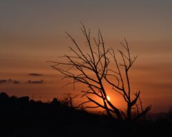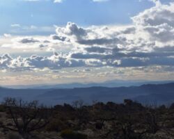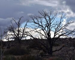 I picked my way through the beach ball sized field and into the larger VW bug sized boulders and on through to the full sized pick-up rocks that seemed to line the edge of the hill. There was a dead Juniper that had perfectly formed in front of, and below, the large balancing rock, growing in a horizontal form, blocking access to getting up into the cave that had been formed. It turned out the balancing rock was not at all, as we were looking at the front edge of a massive boulder reaching far down the hill and only partially resting on the flat stone below. I carefully scrambled around the sharp pointy branch tips of the Juniper sculpture and hopped up onto the flat bed. Unfortunately, its surface was very rough and pointy, as if the City had put sharp points on the park bench to prevent the homeless from sitting. I laid down nonetheless and stared up at the speeding sky. There was so much motion, it almost made me dizzy. I sat up to partake of my last beverage.