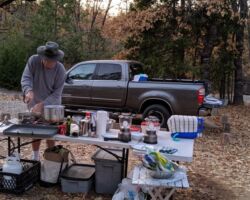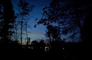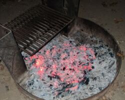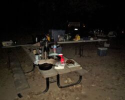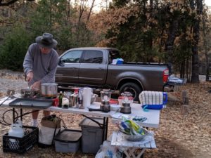 We gathered Bill and occupied our 2 sites and began unloading. The exhausting work called for a break and a beverage so we took the opportunity to contact the rest of the crew to let them know the new plan and location. It was near dark before we got set up and quickly got to fire and food. A white Dodge pickup drove the loop and stopped to ask about paying and site selection and such. Letting him know we couldn’t find anybody or any accurate information, we just set up. He thanked us and drove off only to return and set up camp in the closest site to us just across the road. The entire freakin campground and he sets up next to us. Oh well, I am sure he enjoyed our company.