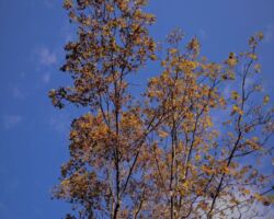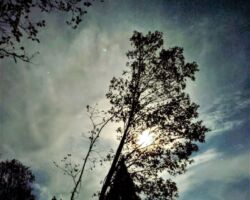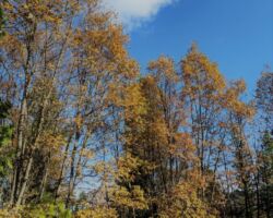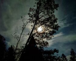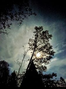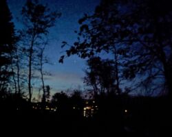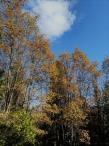 I warmed up some of my chicken thighs I had BBQ’d at home got into some chips, fruit, and snacks, oh and the Manhattans; yes, the Manhattans. Oh my. Food, fire, beverages were all excellent. The weather was great, and although we ended up a stone’s throw from Road 222, there was very little traffic. We could see the lake here and there between the trees. The deer did not seem too concerned with us and we had a gray kitty visitor as well. My bed was excellent and I slept great until the rudeness of the wee hours. Our neighbor decided on an early departure and as most moron campers, he set his stupid fucking useless alarm off. Once awake, I notice the traffic noise was quite substantial. Much heavy equipment, trucks, and massive dumpsters hauling brush and tree residue from all the tree removal. Oh well, time to rise and shine.